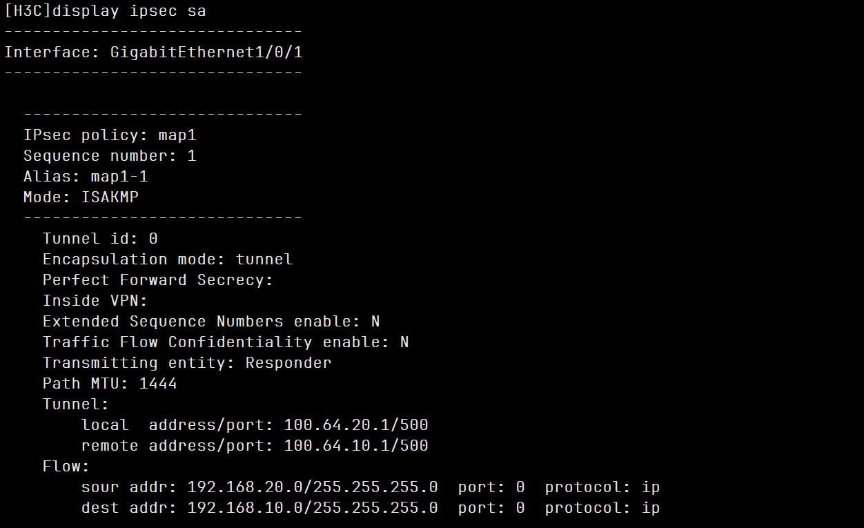 [H3C-ipsec-policy-isakmp-map1-1]remote-address 100.64.10.1