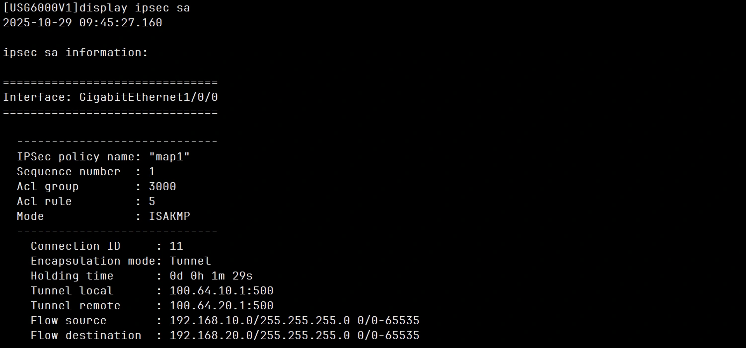 [USG6000V1-GigabitEthernet1/0/0]ipsec policy map1