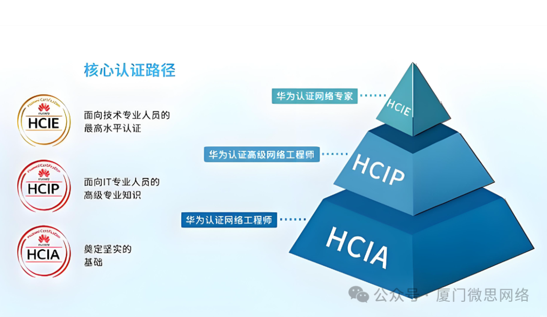 华为数通认证是华为在数据通信领域推出的技术认证体系,主要培养学员在路由交换、网络规划与优化等方面的能力。该认证采用三层分级体系,满足不同基础学员的需求: