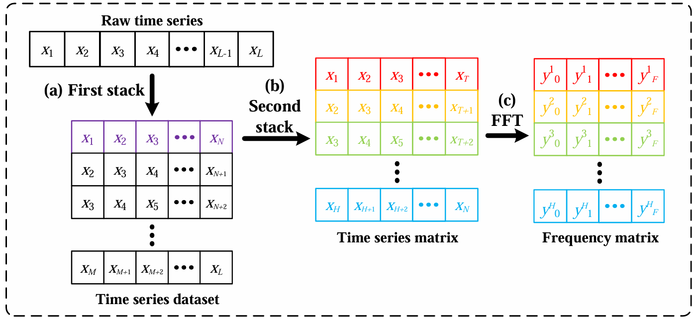 用双滑动窗口与FFT构建频率矩阵,包含频率和时序关联特征,能识别时域难区分的隐藏异常。