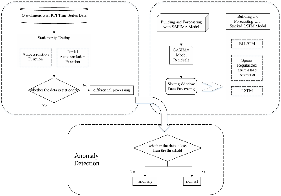 **方法:**论文提出 SARIMA-LSTM 混合模型用于时间序列异常检测,先以 SARIMA 捕捉数据线性趋势与季节性,再将其拟合残差处理后输入带稀疏正则化多头注意力的堆叠 LSTM 做二次预测,依阈值判异常,在 KPI 数据集上表现优于单独的 SARIMA 和 LSTM。