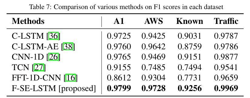 在多个公开数据集上,F-SE-LSTM的检测指标优于主流方法,且训练速度快、模型参数少。