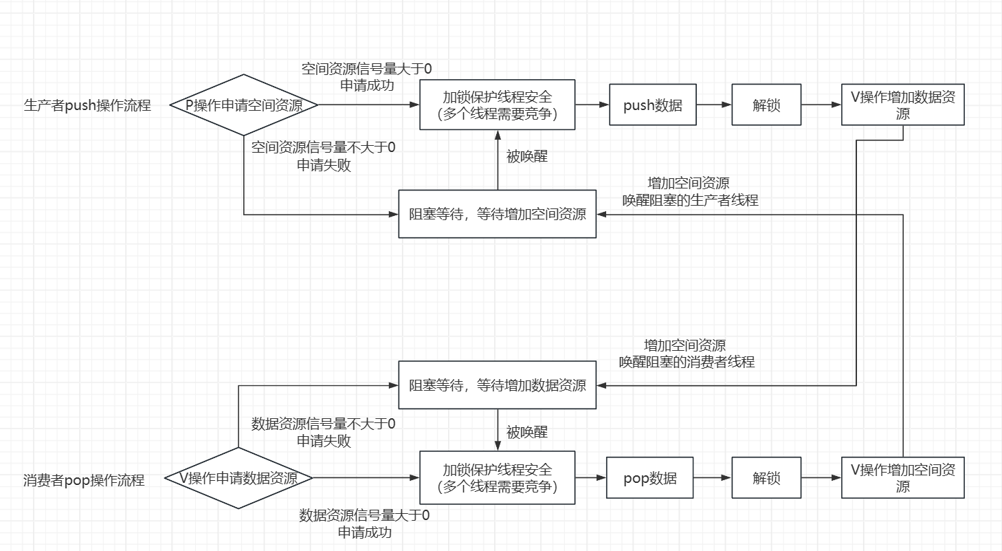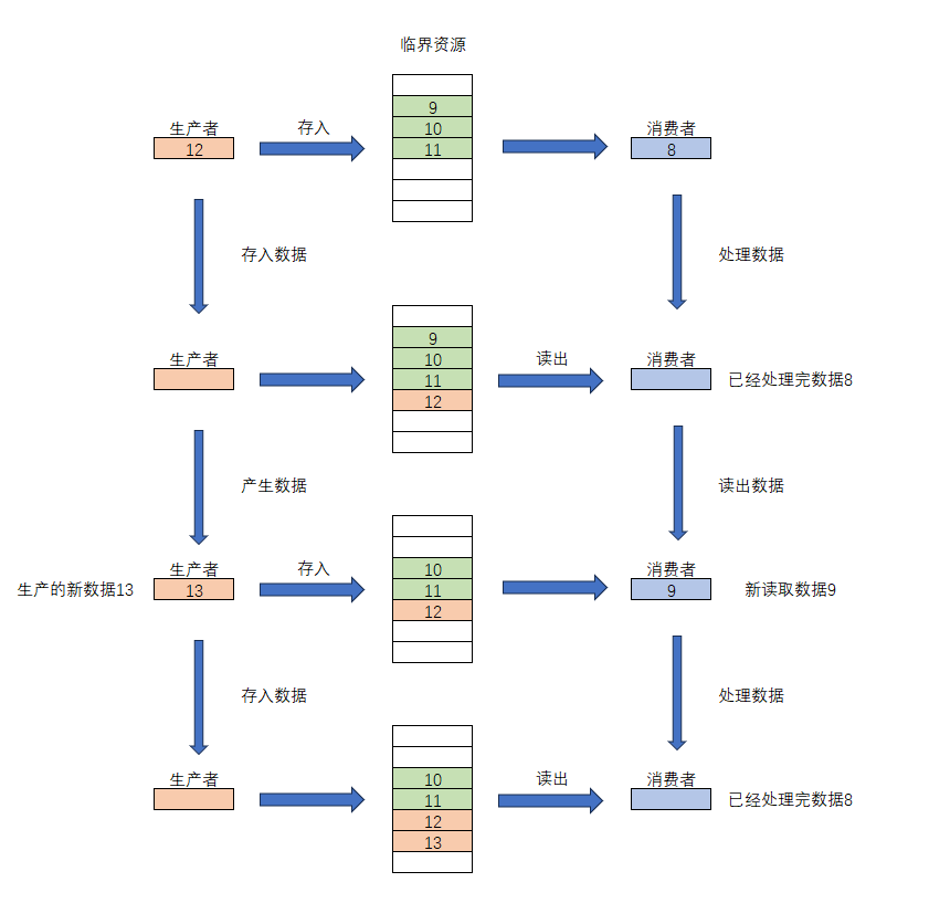多执行流并发的模型,在这种模型中,一定会存在一个临界资源,并且有线程向临界资源内存放数据,我们将存放数据的线程称为生产者,有线程从临界资源内读取数据,我们称之为消费者。若是临界资源内为空,则消费者在读取时需要阻塞等待,若为满,则生产者在存放数据时也要阻塞等待。