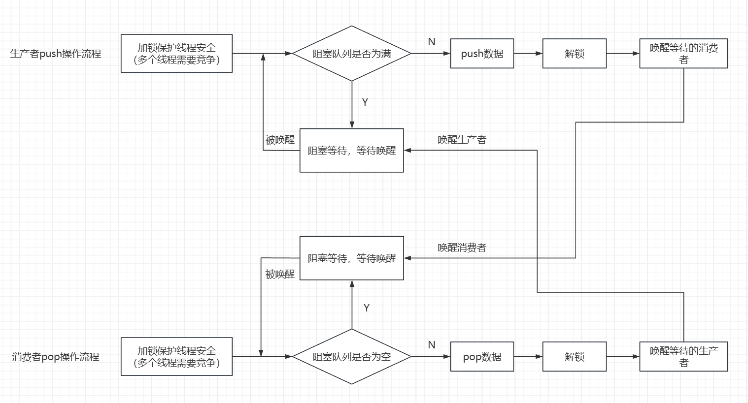 然后进行队列容量判断,若为满,则需要阻塞等待,等待结束后或者不为满就进行数据push,然后释放锁,唤醒其他线程。