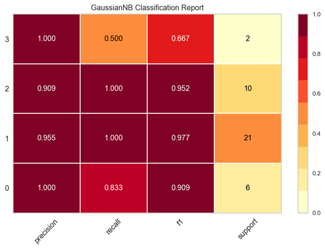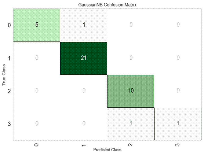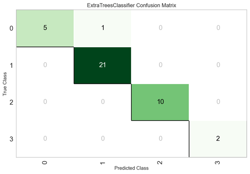 第四行表示所有实际为第四类的样本,其中,1个被正确地预测为第四类,1个被错误地预测为第三类,没有被错误地预测为第一类和第二类。