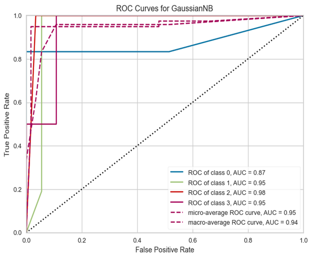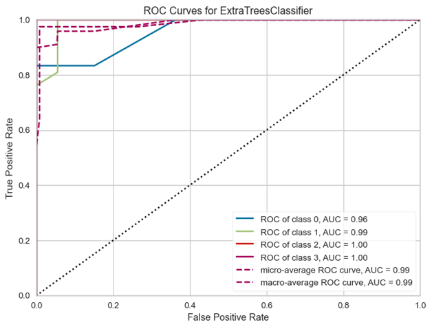 可以看到,四个类的AUC曲线的面积都接近1,意味着该模型在四个类别上的表现都非常好。