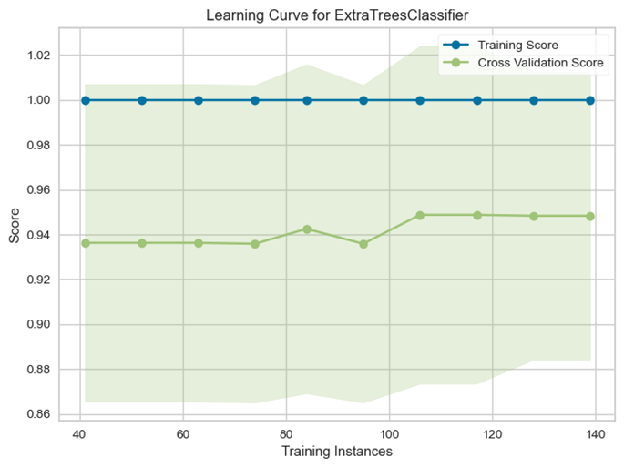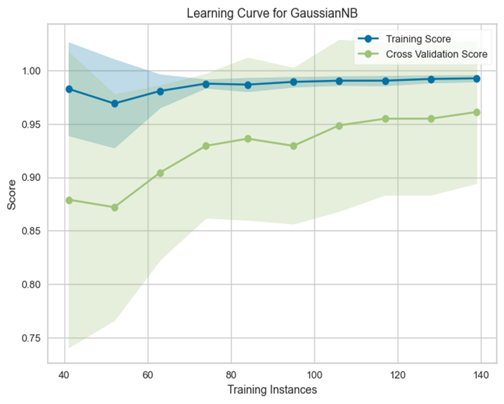 从该模型的学习曲线中可以看出,训练分数和交叉验证分数都接近1,表明模型在训练集和验证集上的表现都很好。该模型的训练分数比交叉验证分数高,意味着模型对训练数据可能有过拟合,但是这种情况下的过拟合程度不高,因为交叉验证分数也很高。由此可以推测,这种情况的出现可能是因为训练数据较少。