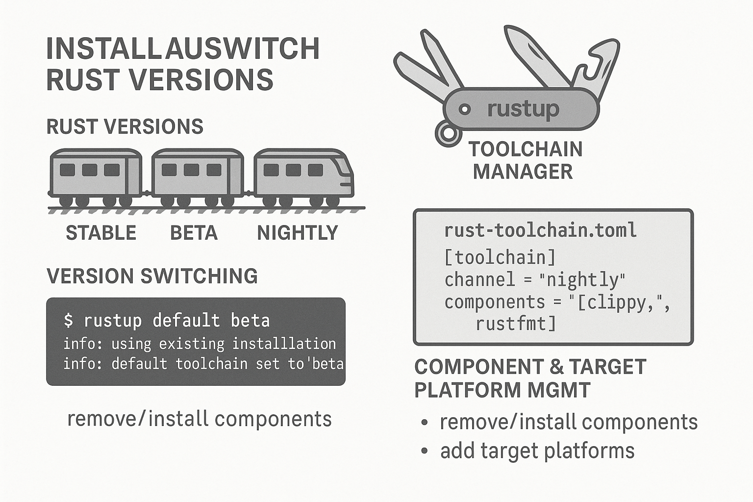 rustup是Rust官方的工具链管理器,其设计体现了Unix哲学中"做好一件事"的理念。它不仅管理Rust编译器版本,还统一处理标准库、cargo、rustfmt等整个工具链生态。