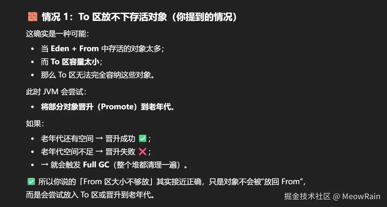 (1)调用System.gc时,系统建议执行Full GC,但是不一定会执行 。 (2)老年代空间不足 (3)方法区空间不足 (4)通过 Minor GC 后进入老年代的空间大于老年代的可用内存 (5)当对象无法放入 To 区(Survivor Space)时,JVM 会尝试将对象晋升 (Promote) 到老年代。