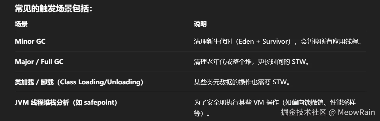 STW(Stop-The-World) 就是: JVM 在执行某些操作时,会暂停所有用户线程(应用线程),只让 GC 线程(或某些系统线程)工作。 当 STW 发生时: