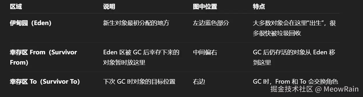 新生代用来存放新创建的对象。大多数对象在这里分配,也大多数会很快被回收。  💡 每次 Minor GC(小型垃圾回收) 都会清理 Eden 区和 From 区,把仍然存活的对象复制到 To 区。然后交换 From 和 To 的角色。