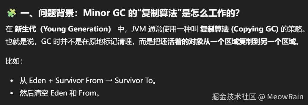 💡 每次 Minor GC(小型垃圾回收) 都会清理 Eden 区和 From 区,把仍然存活的对象复制到 To 区。然后交换 From 和 To 的角色。