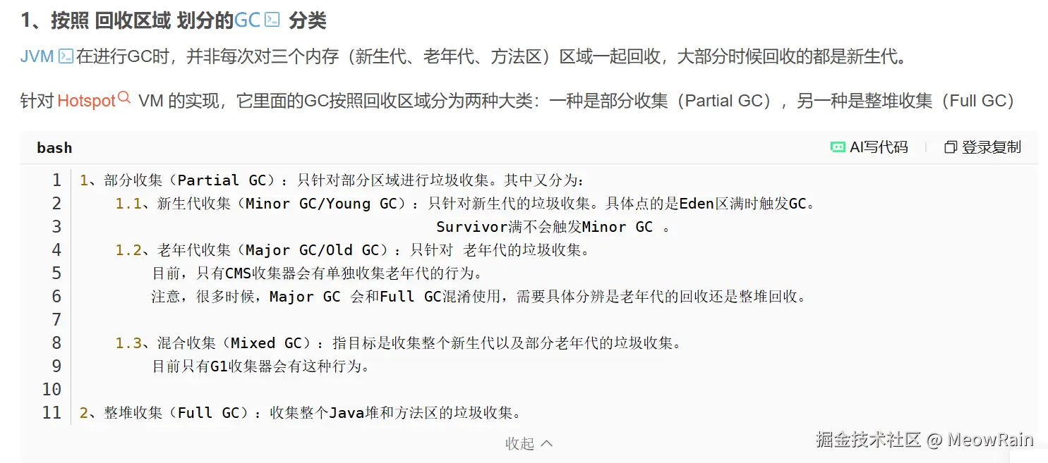 Full GC 对收集整堆(新生代、老年代)和方法区的垃圾收集。