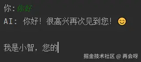 # flush=True保证"AI:"立即输出,而不是等缓存区存满再输出