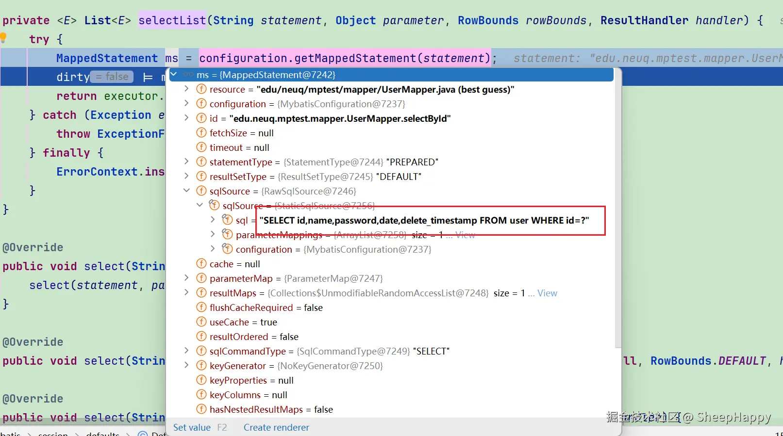 )调试发现:当执行 selectById 时,configuration.getMappedStatement(statement) 能成功获取到对应的 MappedStatement,且 sqlSource 中已包含完整的 SQL 语句:SELECT id,name,password,date,delete_timestamp FROM user WHERE id=#{id}