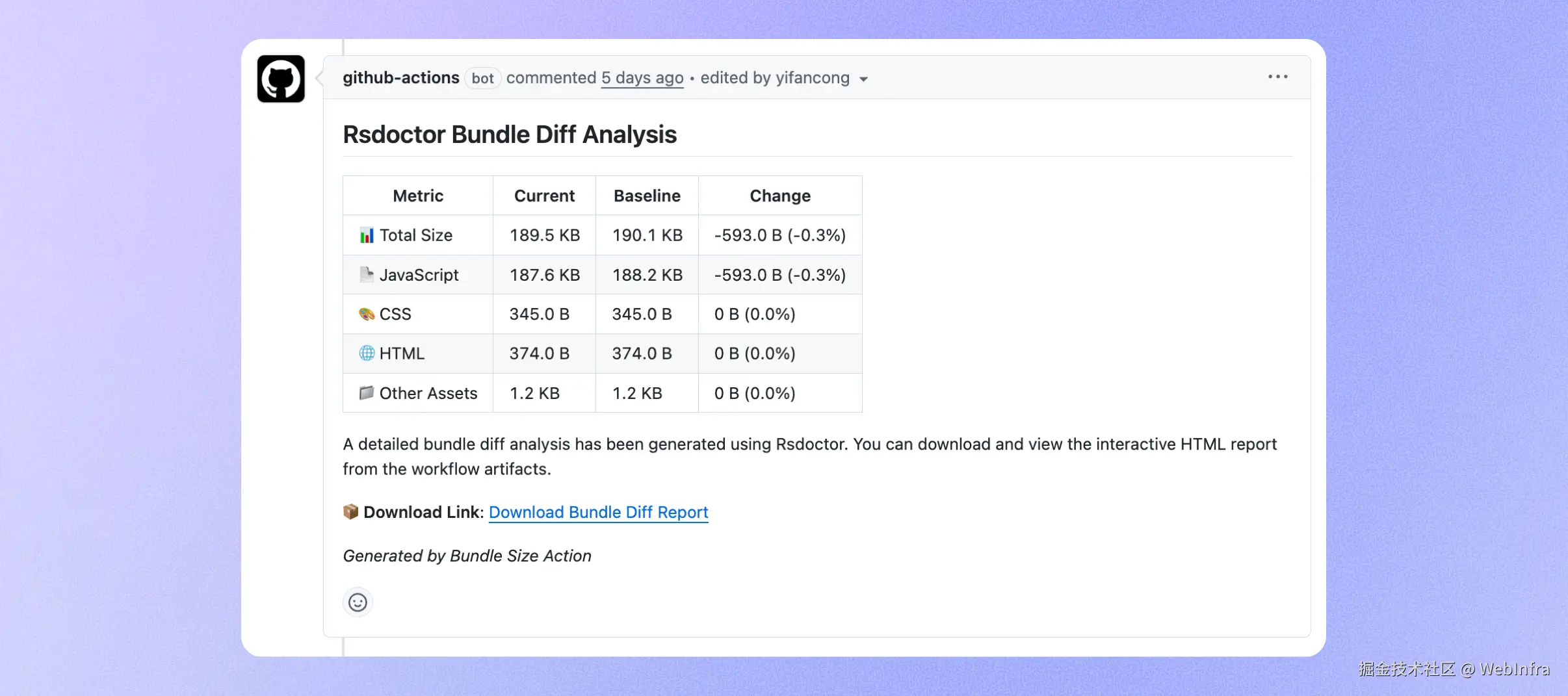 Rsdoctor 现在提供了 GitHub bundle diff action,可以在 CI 阶段自动检测和对比构建产物的体积变化,帮助团队及时发现并预防包体积劣化。