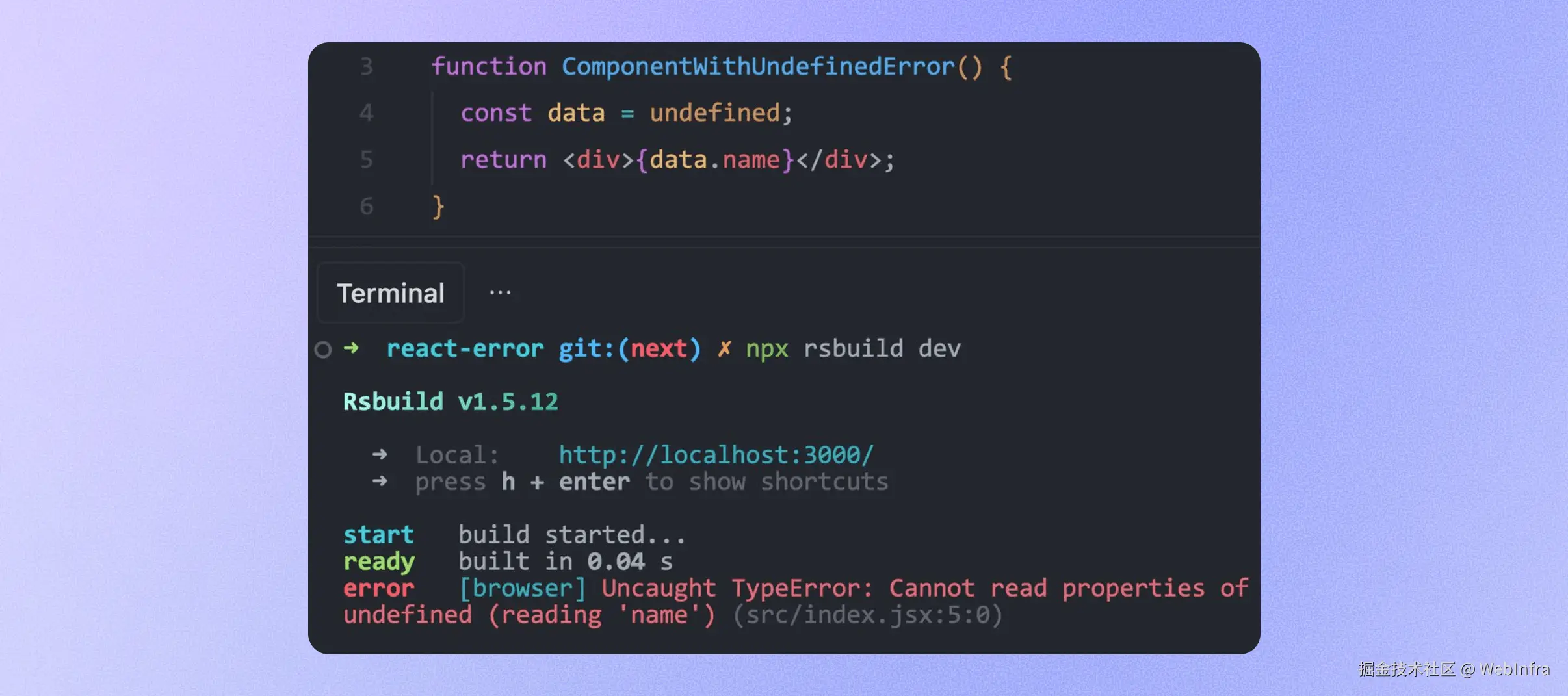 Rsbuild 现在会自动将浏览器中的错误日志转发到终端,帮助你在开发过程中便捷地查看运行时报错,这也使 Coding Agents 能够从终端日志中获取更完整的上下文,从而更好地分析和定位错误。