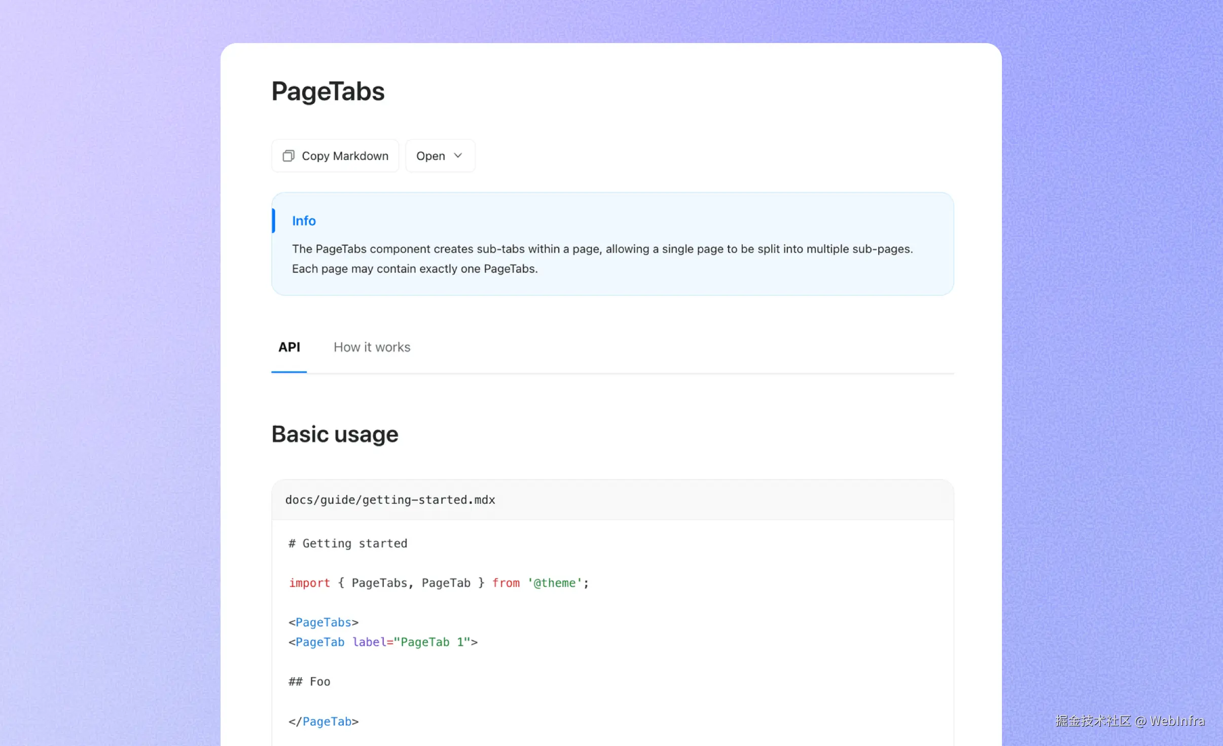 Rspress V2 新增 PageTabs 组件,可在同一页面中创建多个子标签页,将长篇内容自然拆分为结构清晰的子页面。