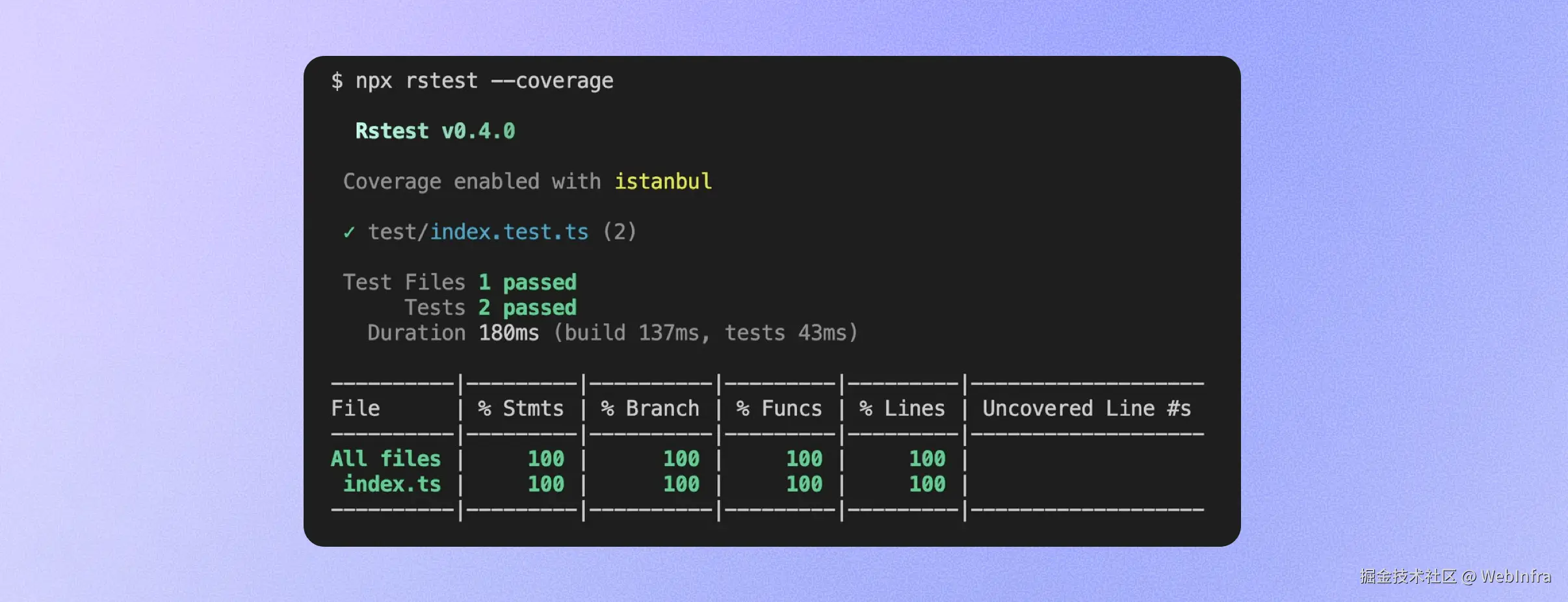 Rstest 现已支持使用 istanbul 收集代码覆盖率并生成覆盖率报告,详见 Rstest - 代码覆盖率。