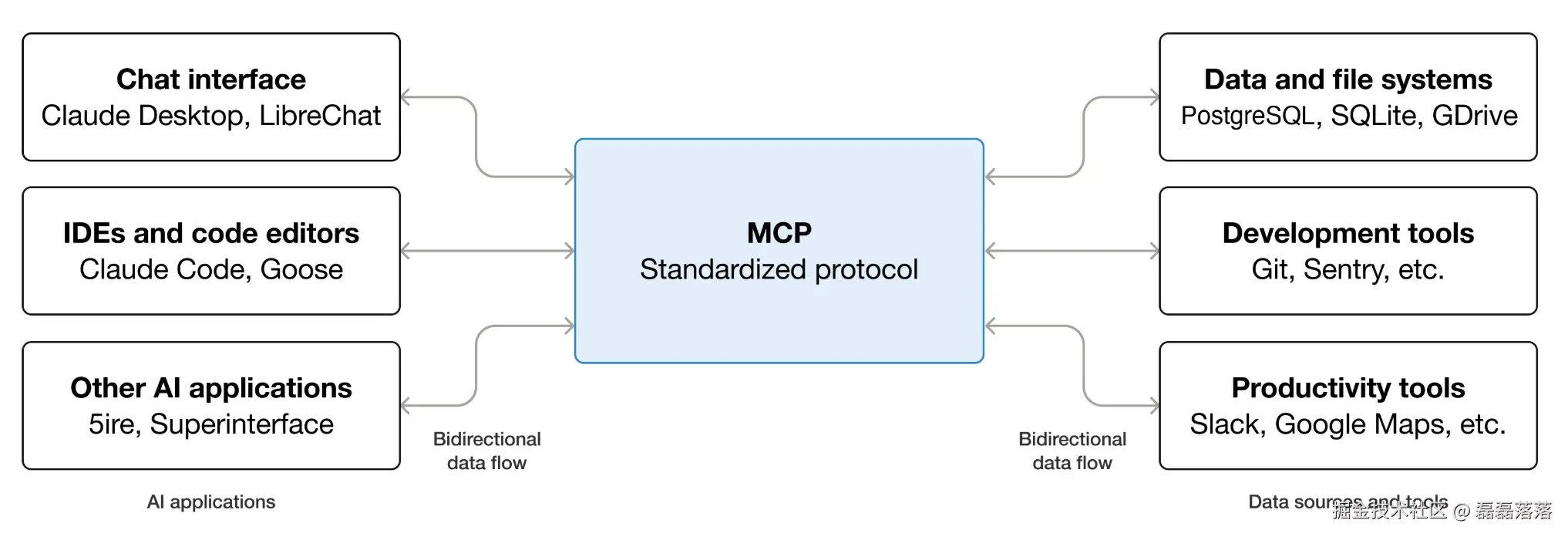 MCP(Model Context Protocol,模型上下文协议)就是为了解决上述问题而生,其由 Anthropic 公司于 2024 年底提出,试图定义一个统一的标准来供大语言模型和外部应用程序交互。