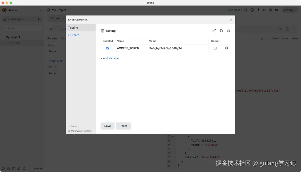 开发、测试、生产环境切换是刚需。Bruno 提供内置环境管理: