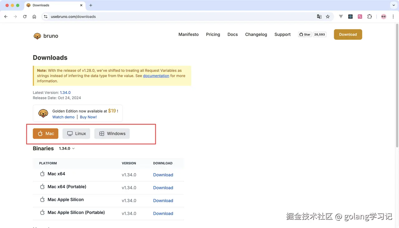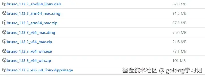 选择对应操作系统的安装包(支持 .dmg、.exe、.AppImage 等)。从这里就可以看出bruno只有不到100M,和postman的500M比起来就清爽多了!