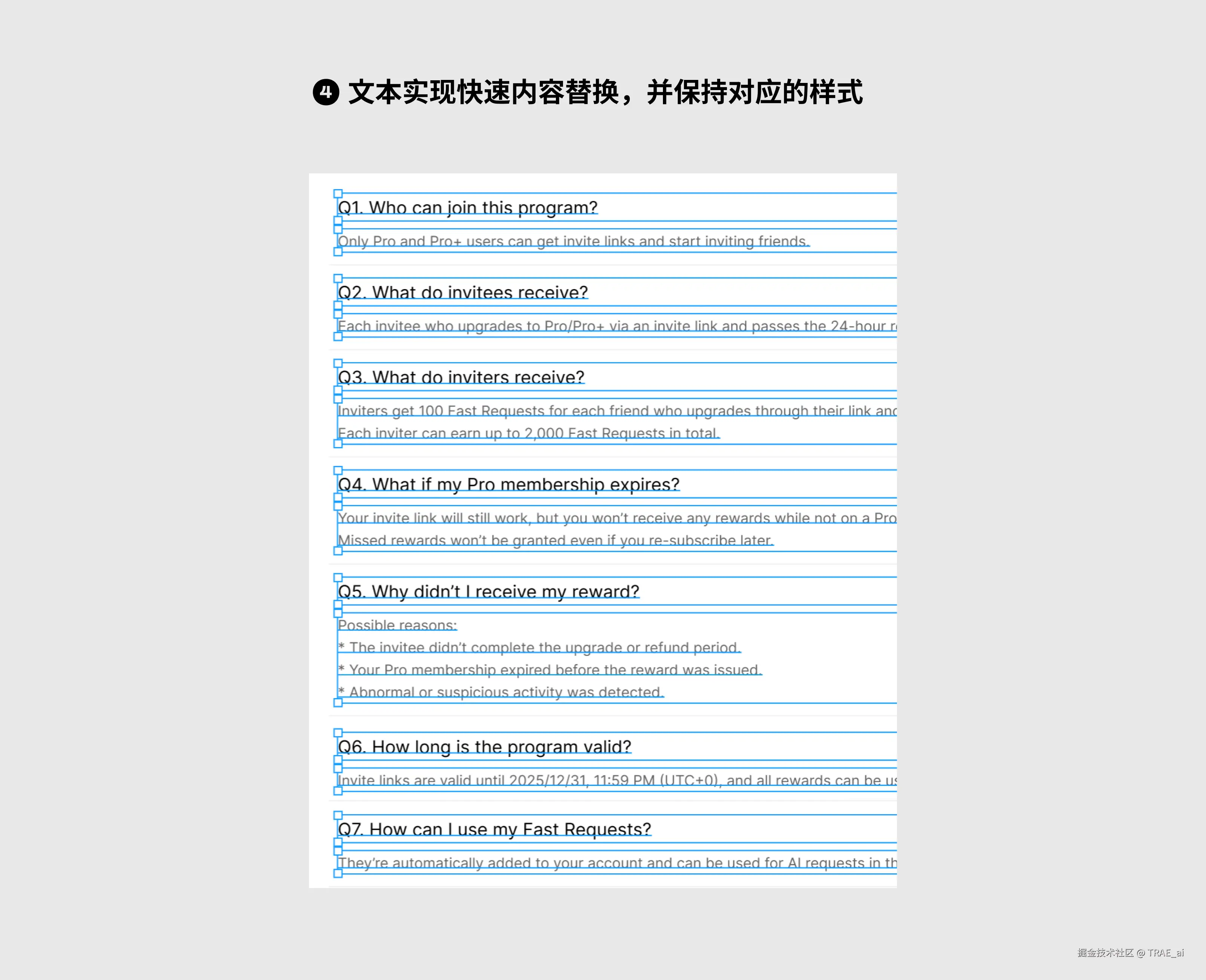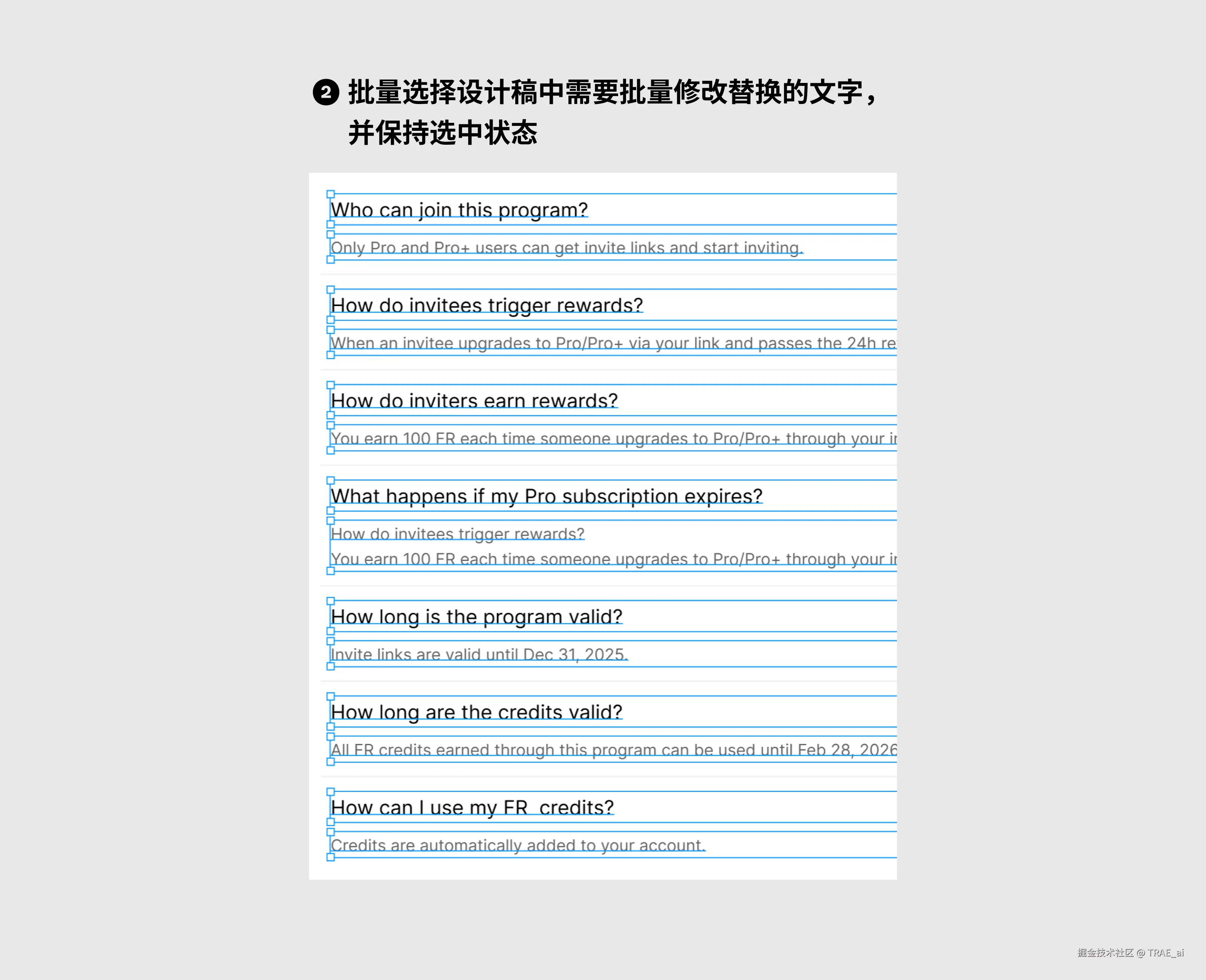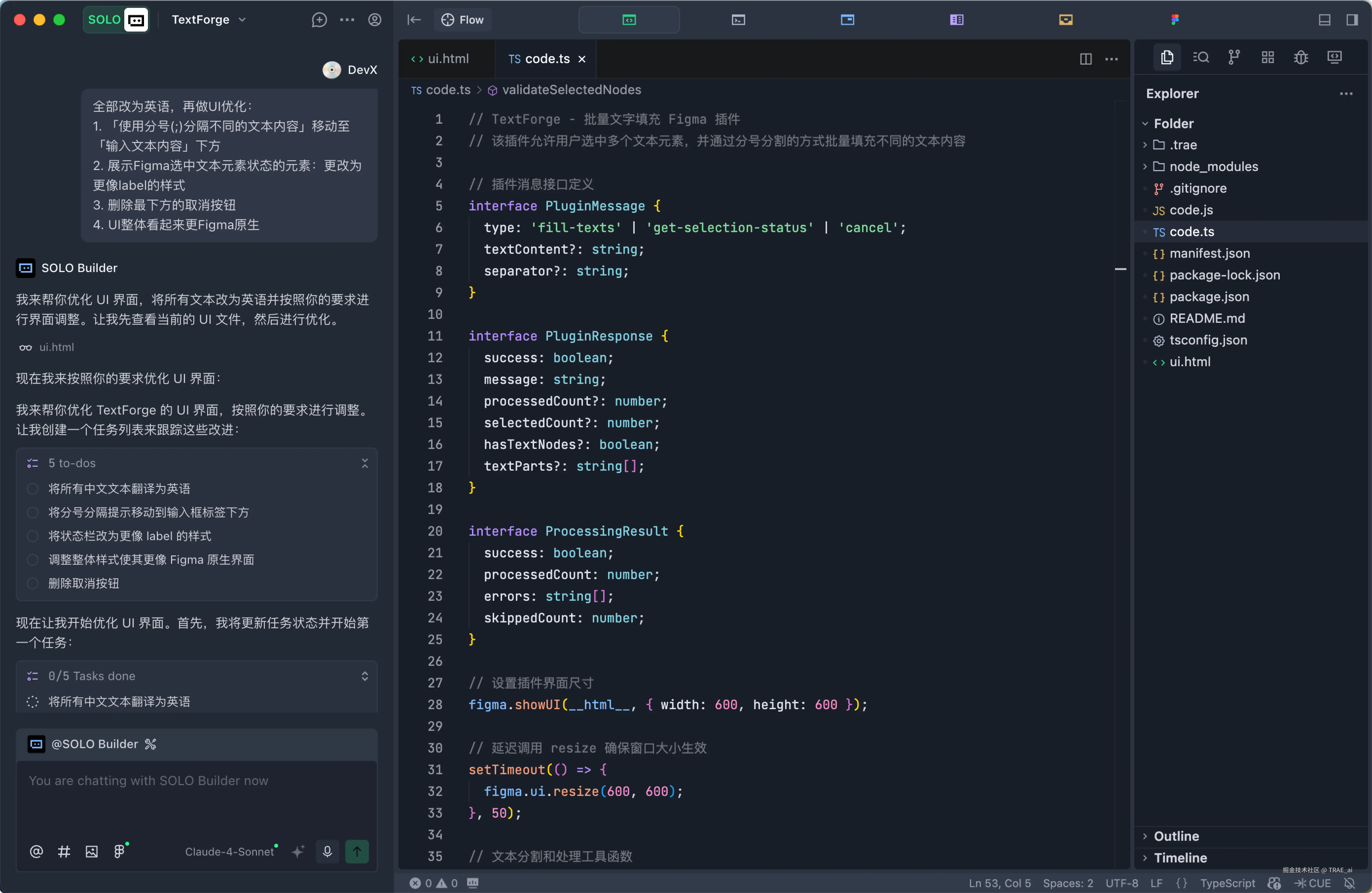 通过 TRAE SOLO,5min 开发完成 Figma 批量替换文本内容插件,10 段文本替换耗时<40s,提效 56%
