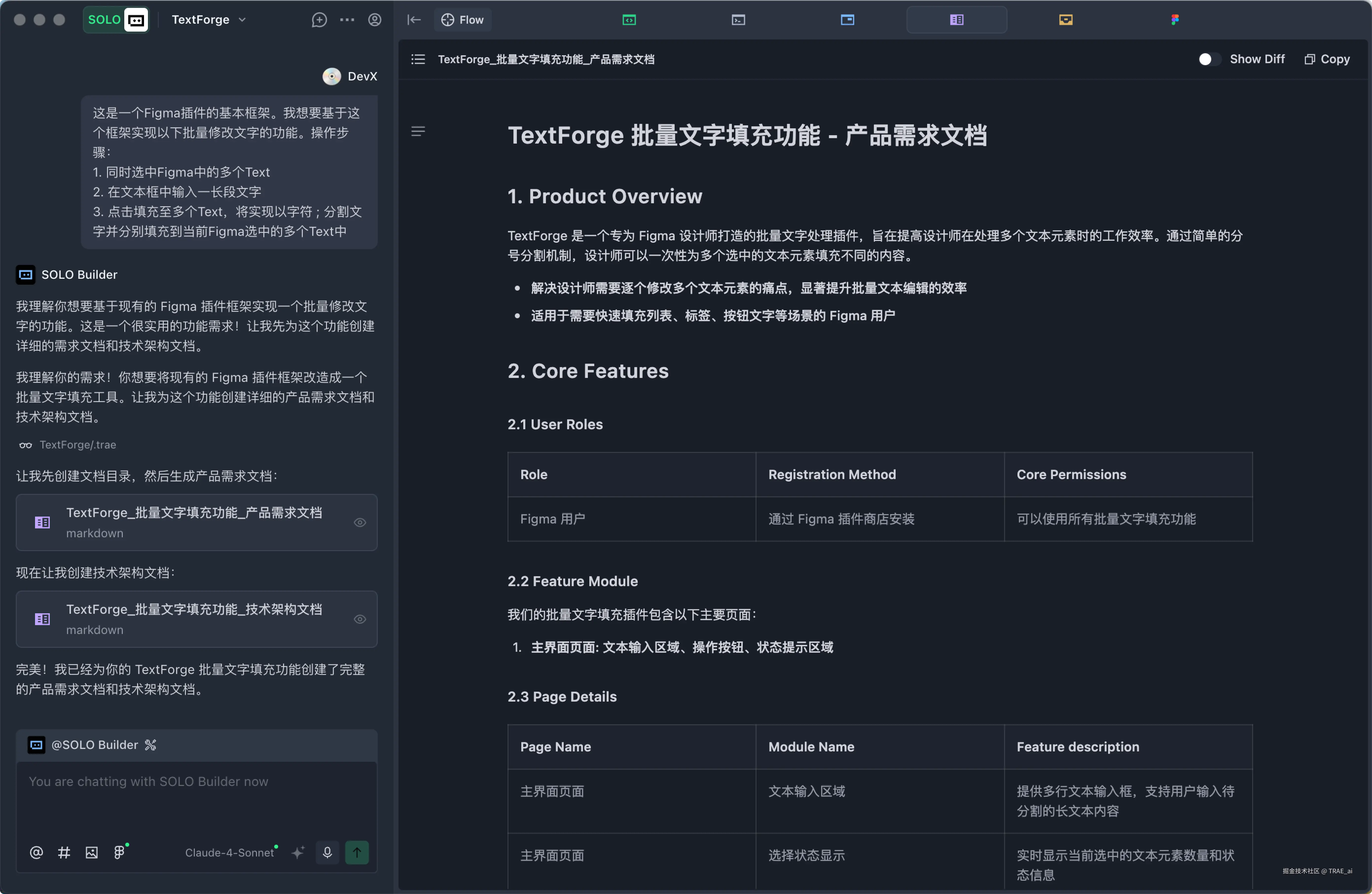 - 在 TRAE 中打开上一步保存的文件夹。初步描述功能,SOLO 会帮你生成详细的 PRD 和技术方案。