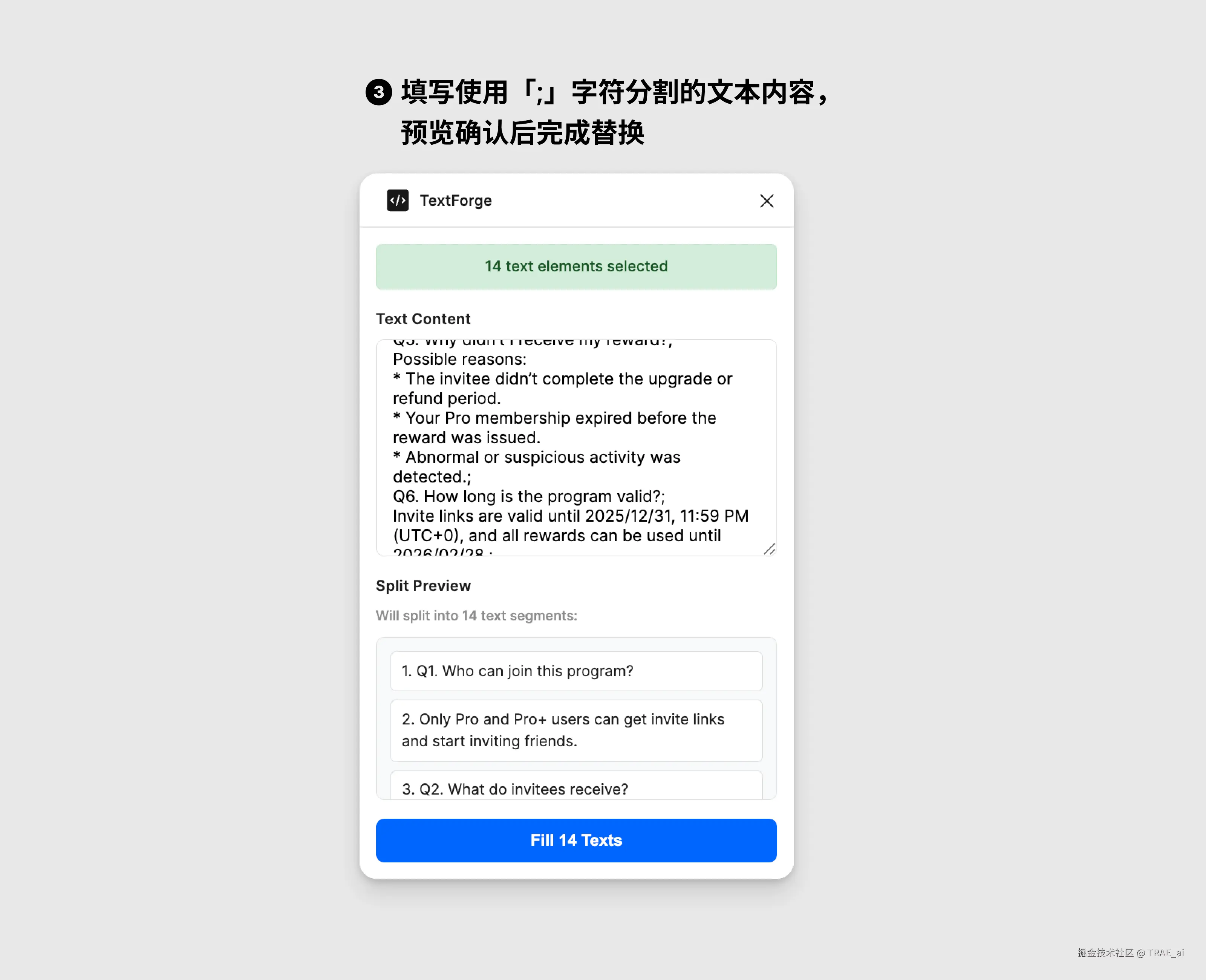 文本拆分: 将输入内容按照分号(;)自动拆分,并按顺序分配至各文本图层