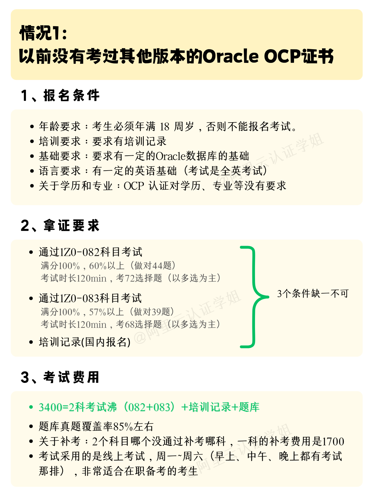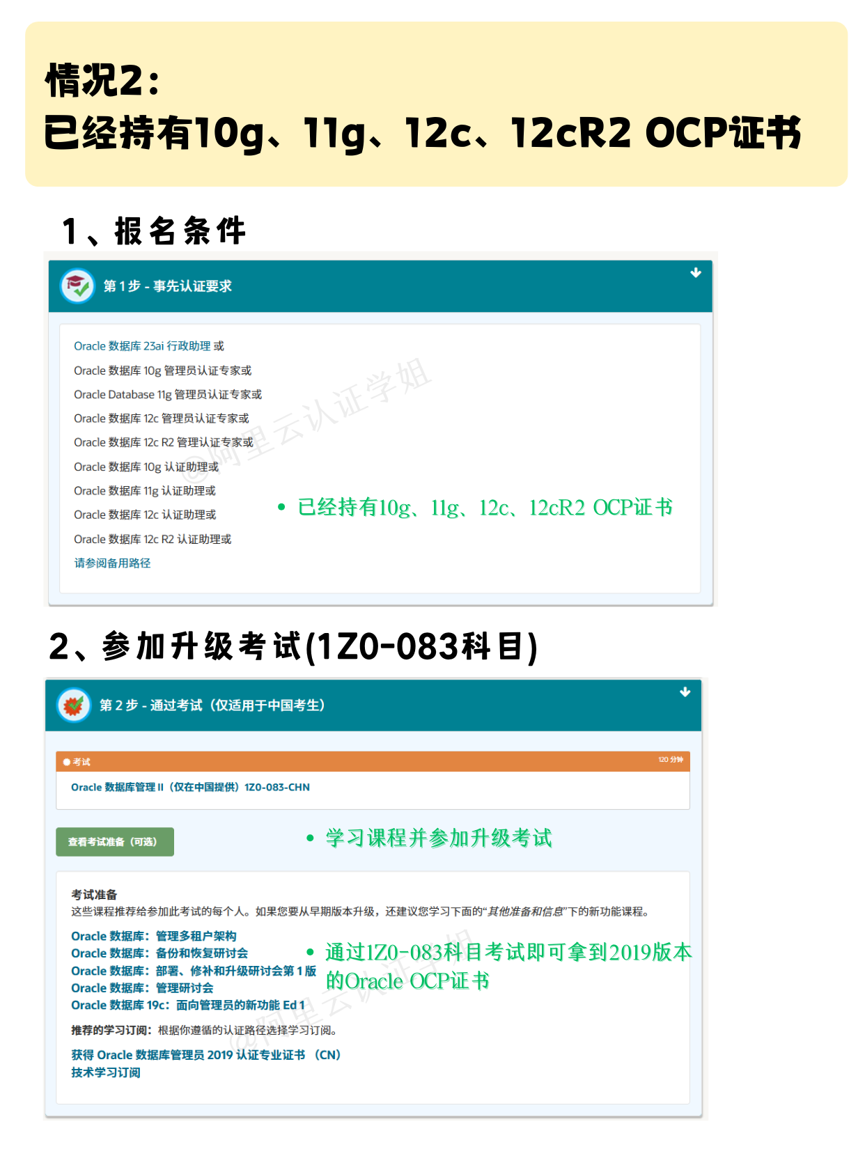 ⚠️想拿到Oracle OCP(Oracle 19c)有2种情况:一种是以前考过低版本(10g、11g、12c、12cR2 OCP)的OCP证书;一种是以前没参加过OCP考试。这两种情况如何才能拿到Oracle OCP(Oracle 19c)证书呢?