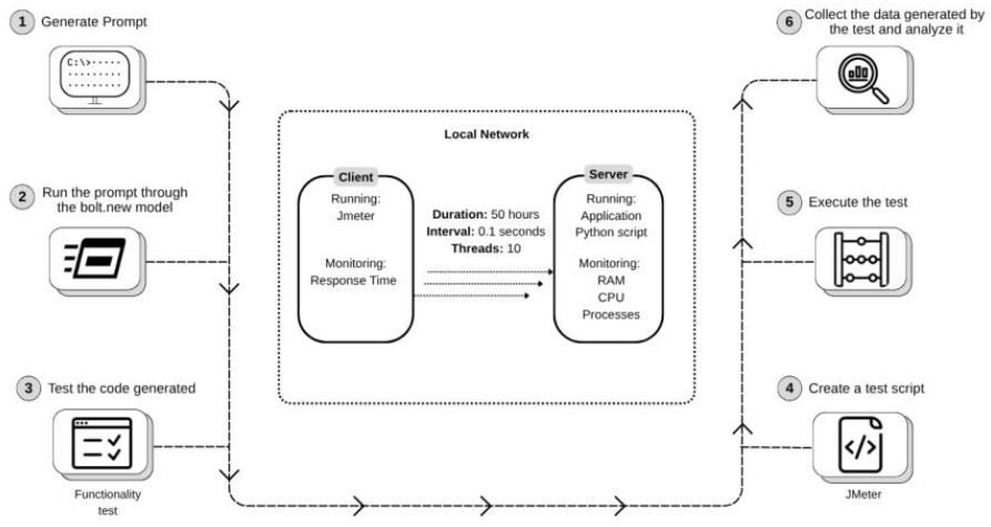 提出专属的老化评估方法论:针对LLM生成软件的特点,设计了"标准化生成(用Baxbench基准Prompt)+长期负载(50小时JMeter施压)+多维度监控(内存、响应时间、吞吐量)"的流程,这套方法能复现、可推广,为后续研究提供了模板。