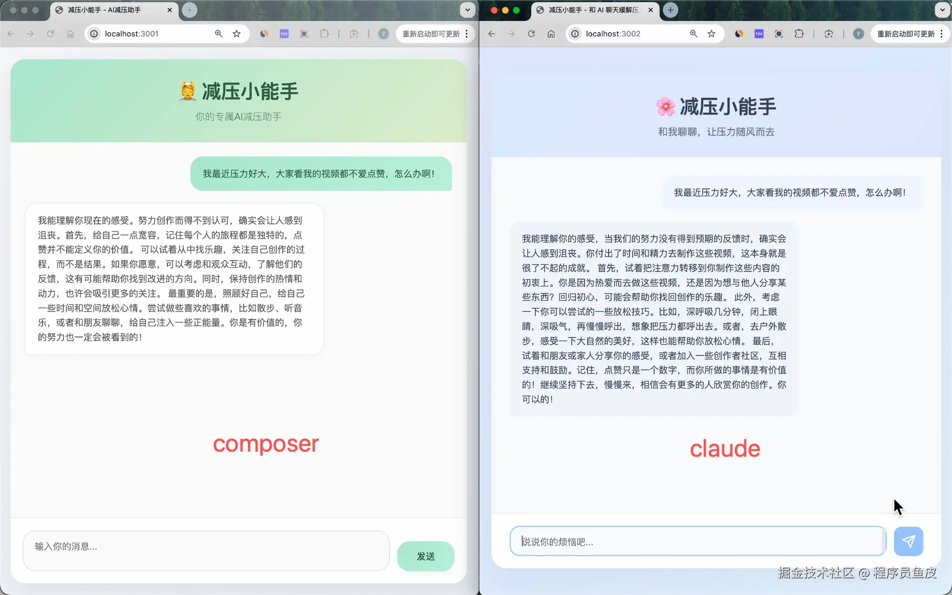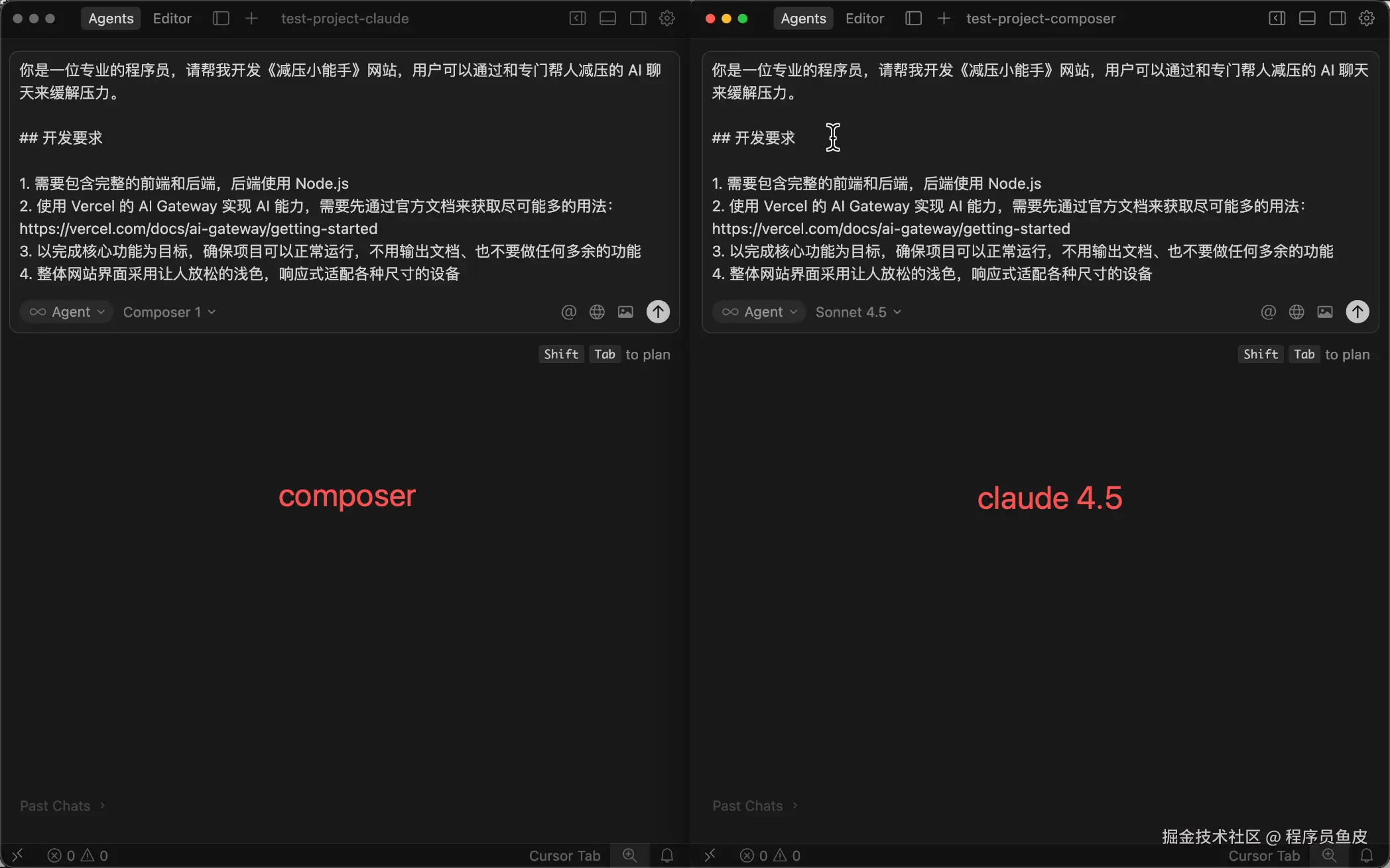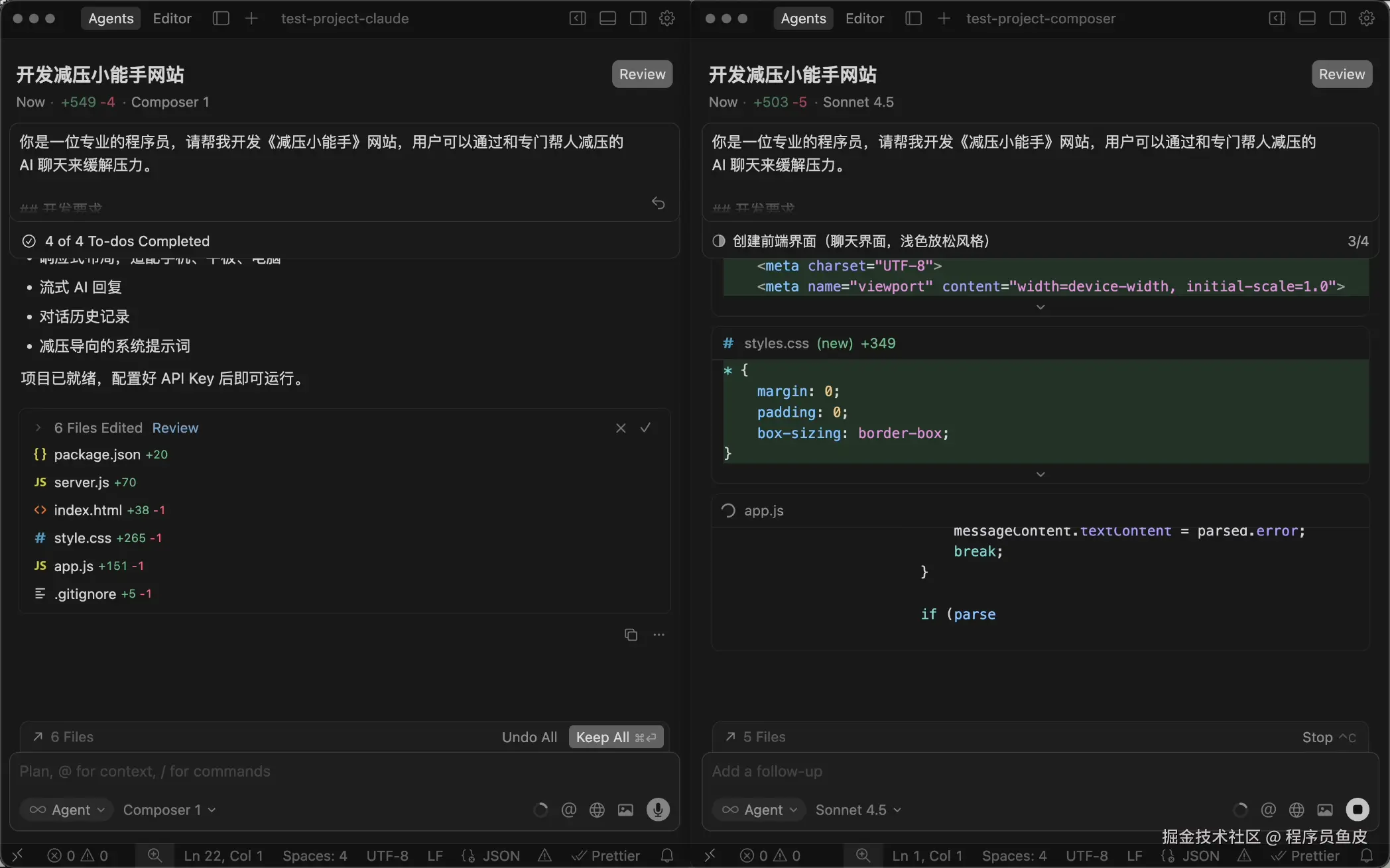 左边是 Composer,右边是 Claude,二者都生成了能够正常使用的代码,效果也是旗鼓相当,这么看来 Composer 确实很香。