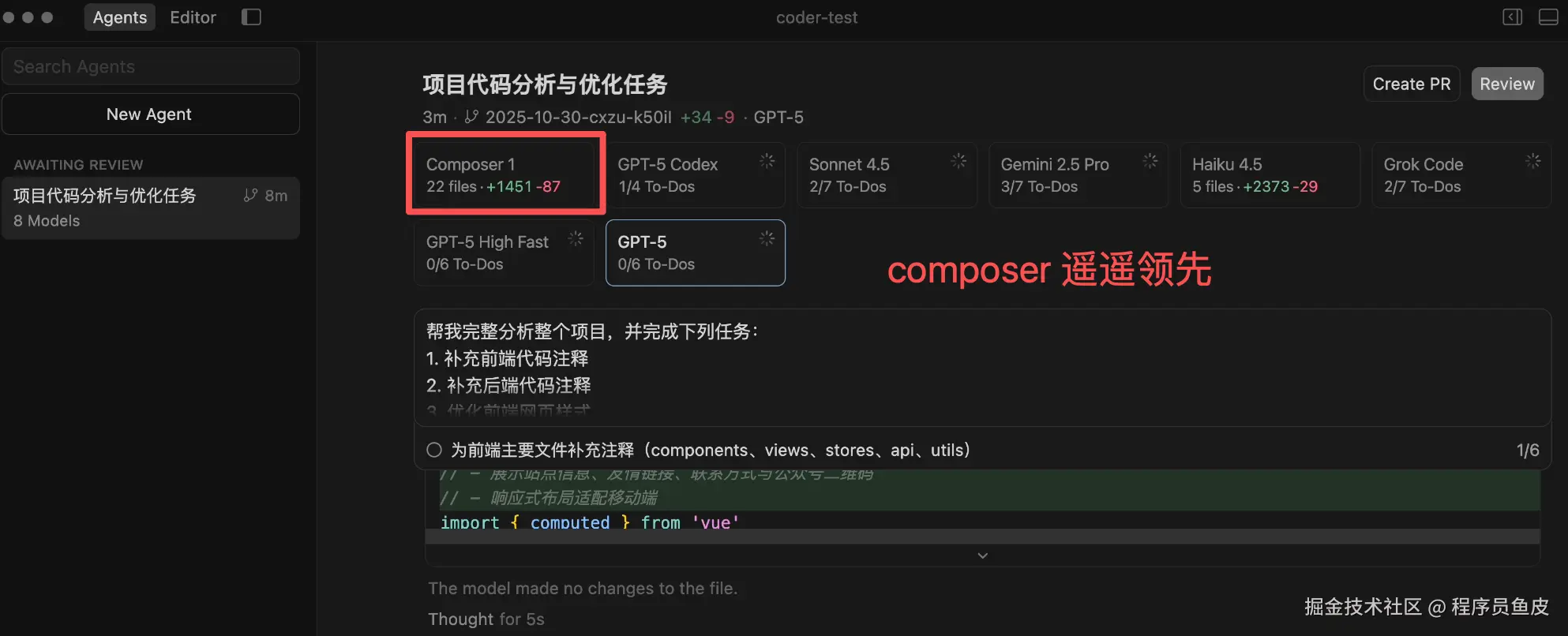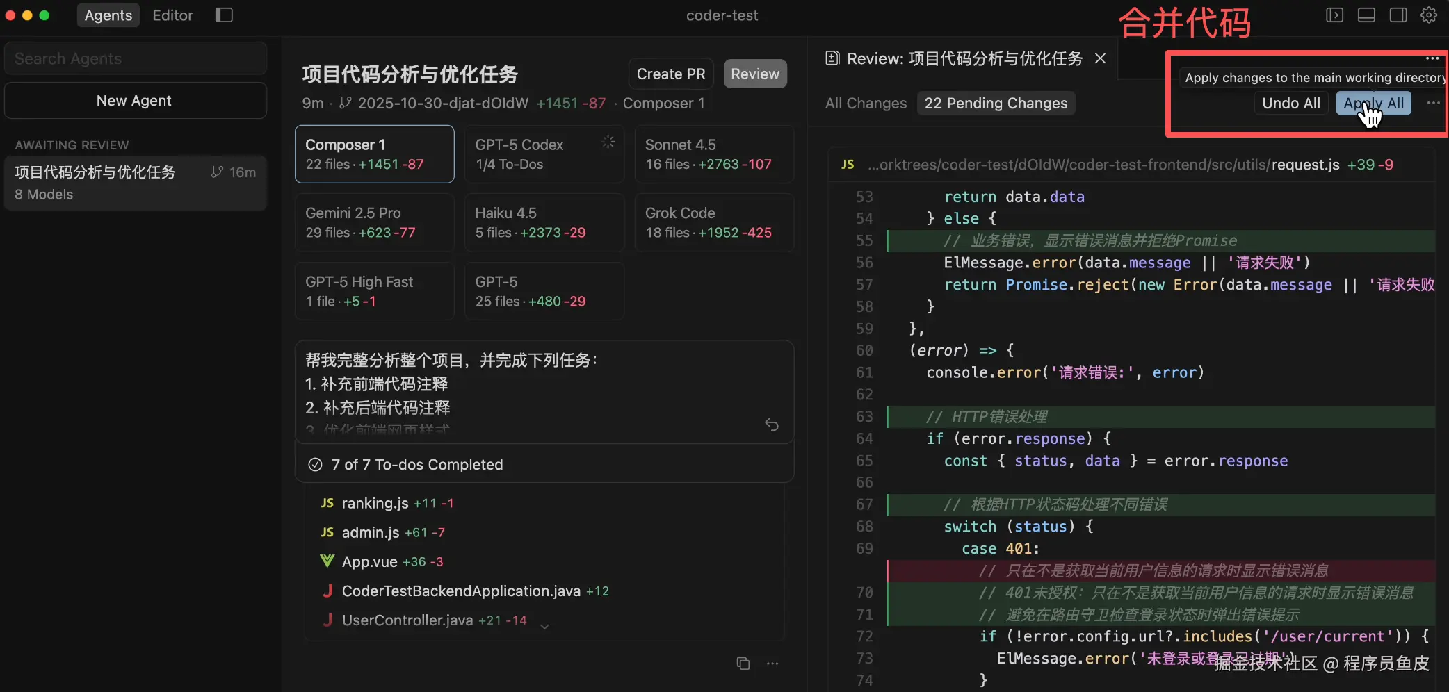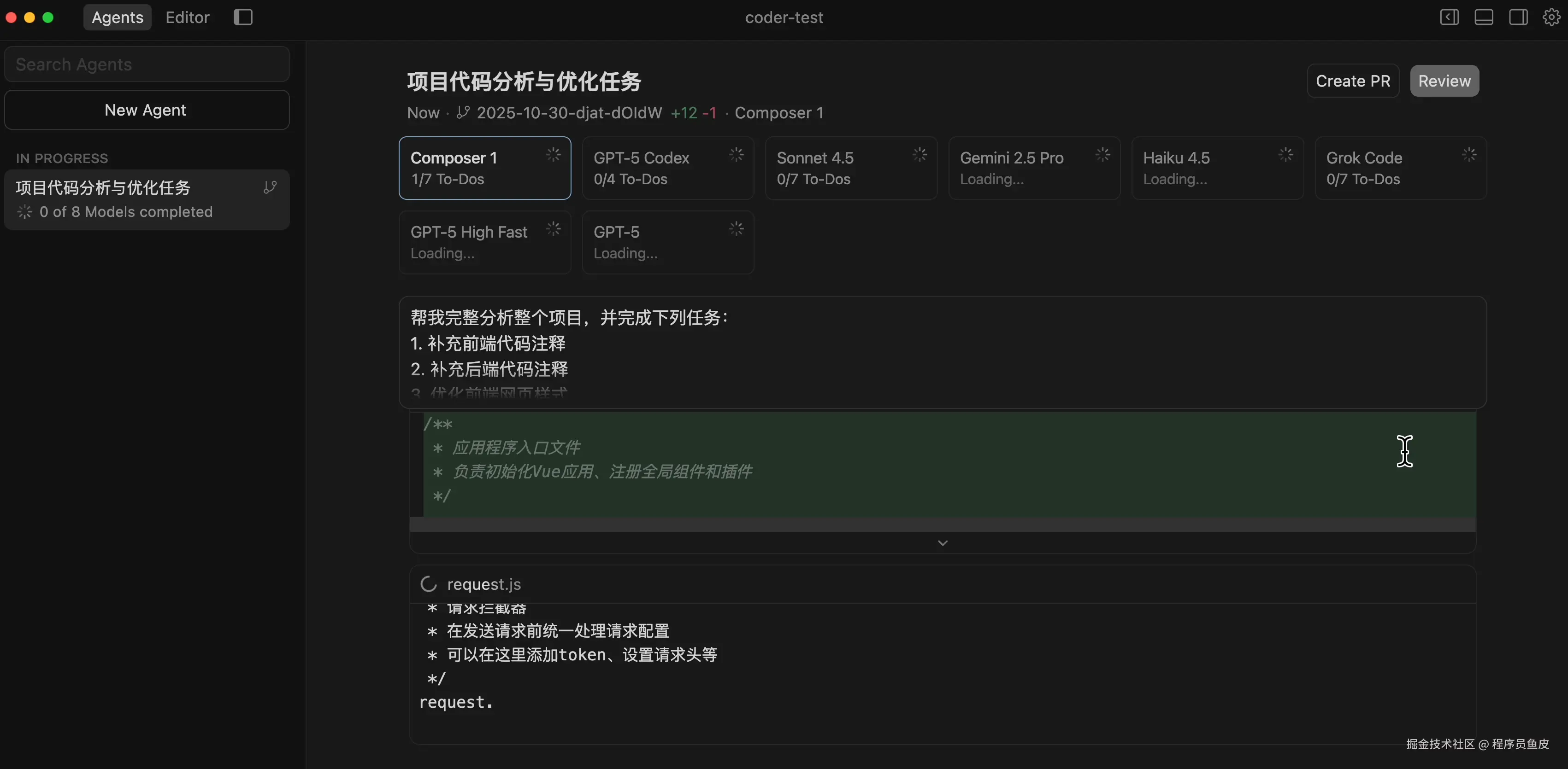 - 代码审查改进:现在能跨多个文件统一查看 AI 的所有修改,不用一个个文件跳了,类似 GitHub 的 PR diff 视图。