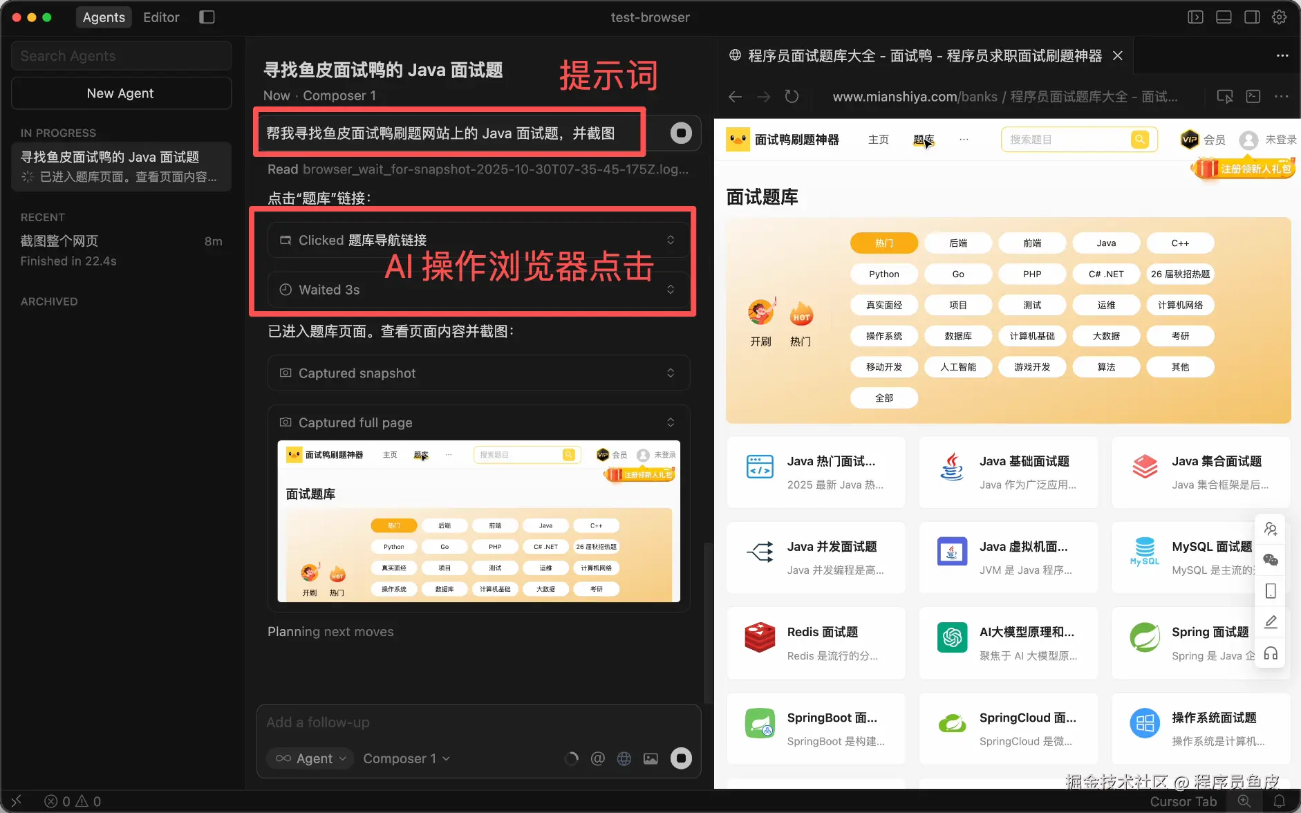 帮我寻找鱼皮面试鸭刷题网站上的 Java 面试题,并截图以前 AI 只能利用工具从网络搜索,有些内容可能获取不到。现在 AI 可以自己打开网站,用鼠标点击探索,找到对应内容,再截图汇报给我,非常方便。