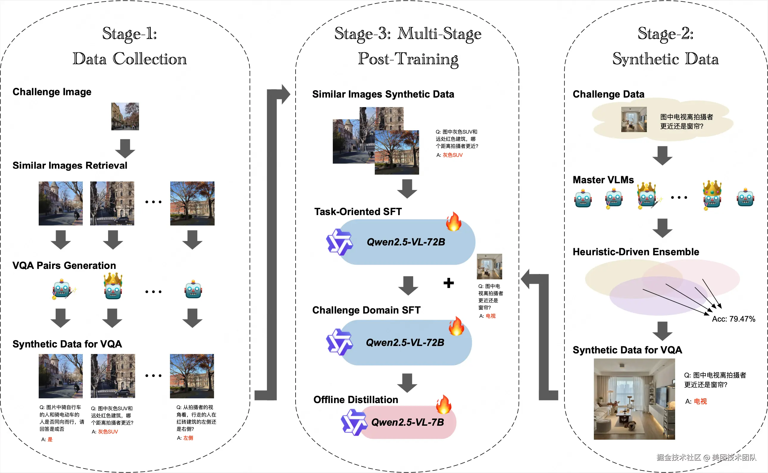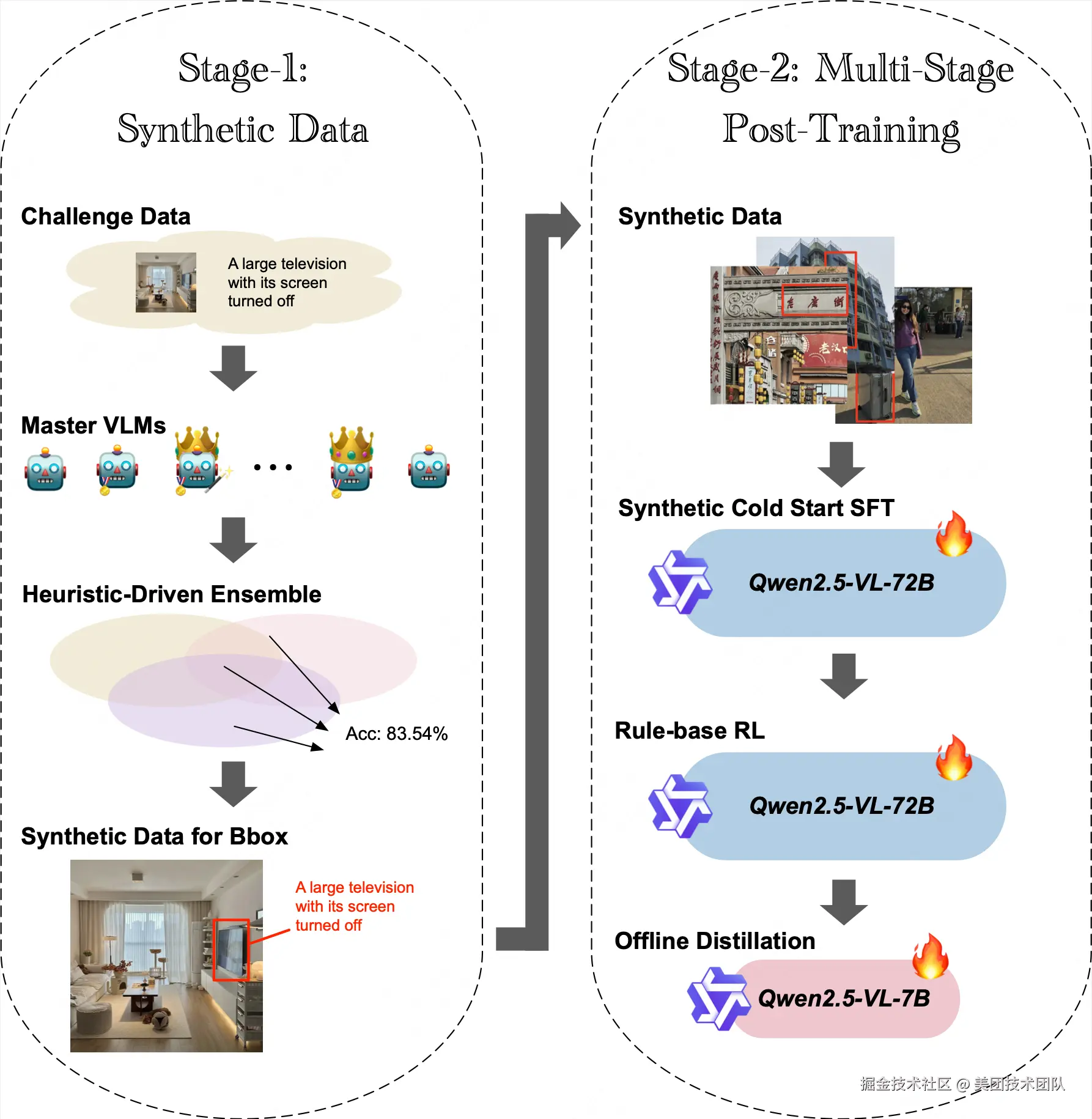 接着在无答案比赛数据集上,我们进一步精调多个SOTA模型prompt,并以集成方式合成出少量高置信的比赛数据样本,之后使用这批合成数据对Qwen2.5-VL-72B-Instruct进行第二阶段SFT,进一步提升了模型在比赛数据上的表现;