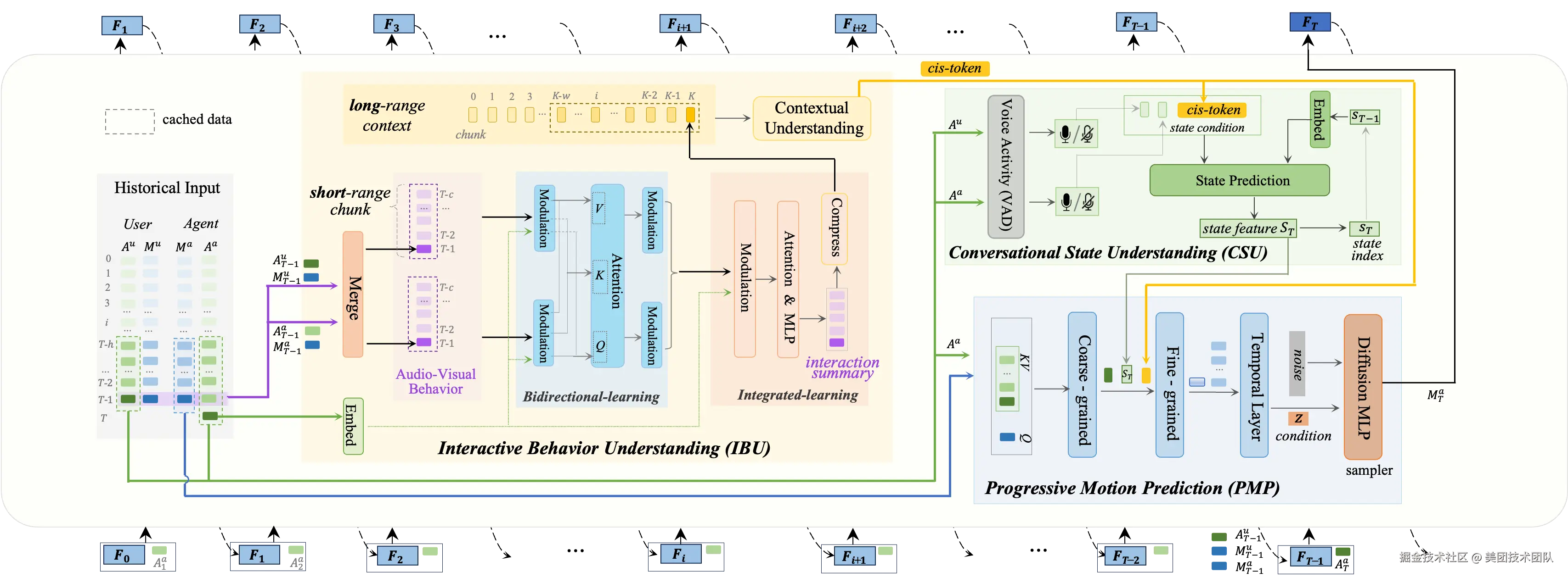 论文简介:在2D可交互数字人生成任务中,之前研究采用了clip-wise的diffusion生成范式或显式的听者/说者切换方法,它们在未来信号获取、上下文行为理解和状态切换平滑度方面存在局限性,难以实现实时性和真实感。本文提出了一种基于自回归 (AR) 的逐帧生成框架 ARIG,采用AR+diffusion框架以实现流式实时生成,并充分利用上下文语境和复杂对话状态理解实现了更高的交互真实感。