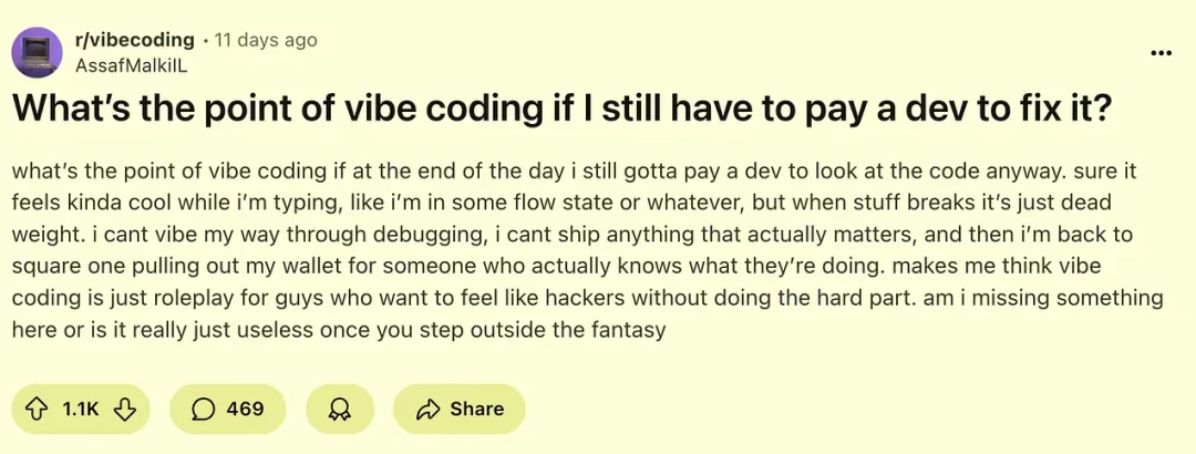 批评声中,开发者们讲述氛围编程如何负面影响其工作流程与团队协作。某 Reddit 热帖 [9] 的最高赞评论慨叹: