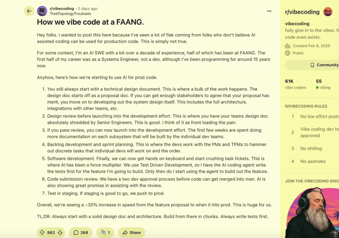 氛围编程(vibe coding)与专业化的 AI 辅助工程实践存在本质区别。最近一篇 Reddit 帖子[1]揭示了 FAANG 团队运用 AI 的具体案例,该案例引发了关于"氛围编程"与专业"AI 辅助工程实践"的深度讨论。