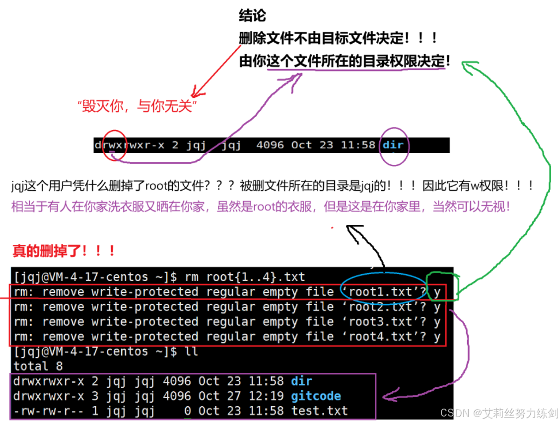 -rw-rw-r-- 1 jqj jqj    0 Oct 23 11:58 test.txt5.2.3 删除文件不由目标文件决定,由你这个文件所在的目录权限决定
