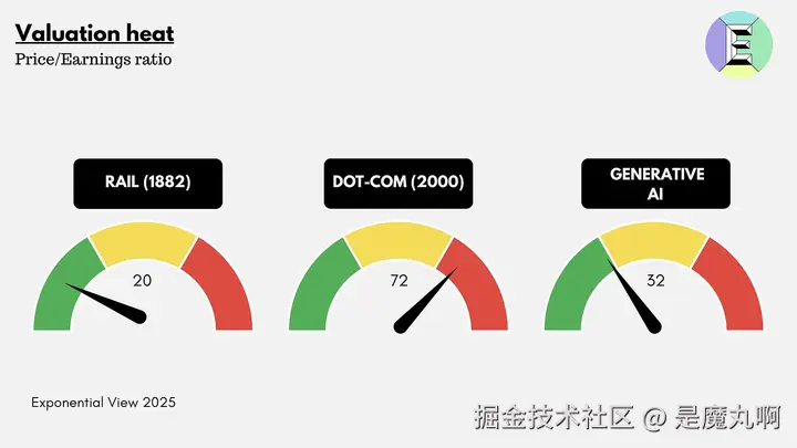 今天,情况要平静得多。纳斯达克P/E约为32,是互联网时代的一半。更广泛的科技市场高于长期平均水平,但远未达到互联网泡沫的领域。与铁路泡沫相比,铁路泡沫估计P/E约为20,它很高。但铁路最终结局糟糕,不是因为估值本身极端,而是因为收入增长衰退。相比之下,生成式AI收入仍在快速加速。