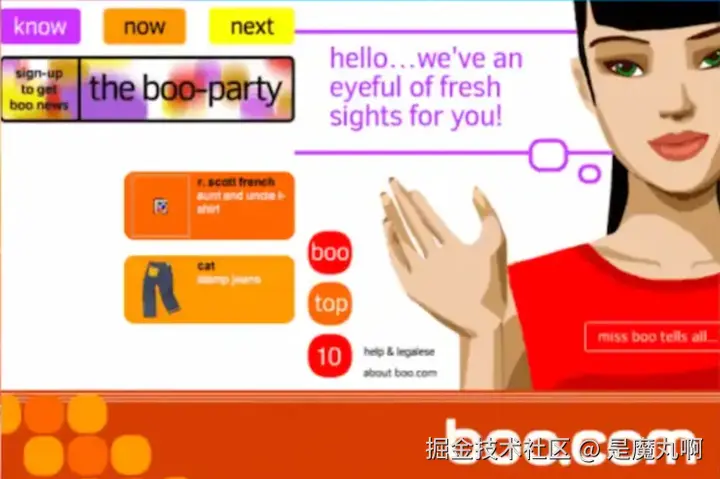 它在发布前在广告上花费了2500万美元,员工从40人膨胀到400人,在纽约和欧洲各地开设了豪华办公室。JavaScript和Flash沉重的网站在拨号连接上几乎不可用,与Mac计算机不兼容且有错误。四分之一的购买尝试失败。尽管奢侈------豪华派对、协和飞机航班和Miss Boo的名人造型师------但民意调查显示只有13%的互联网用户知道这个品牌存在。18个月内,钱没了。Boo.com在2000年5月崩溃了。