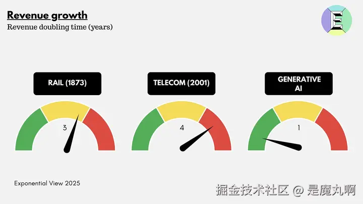 我们的收入增长仪表盘是指数性的。它衡量收入翻倍时间(以年为单位);即,在当前增长率下,行业收入翻倍需要多长时间?在这里,生成式AI完全处于绿色区,每年翻倍。