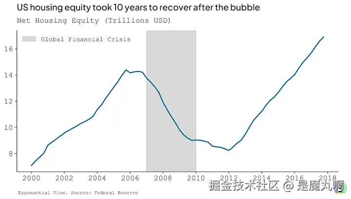 生成式AI正在发生的事情与此相比不值一提。这里的关键衡量标准是市盈率(P/E),即投资者实际上为支付多少年当前利润的简写。如果一家公司有1美元的年收入,P/E为20,买家为每美元当前利润支付20美元,假设增长将使这值得。高P/E意味着公司押注于快速的未来增长,但太高太久,投资者可能正在买入一个幻想。在互联网时代就是这种情况。在峰值,纳斯达克的P/E约为72。一项详细研究估计仅互联网股票就带有隐含P/E 605。换句话说,投资者愿意支付超过六个世纪的当前收益。问题不是需求消失了------亚马逊的收入从2000年的27.6亿美元增长到2001年的31.2亿美元------而是没有公司能够增长得足够快以证明那些天文般的期望是合理的。基本面改善了,但期望崩溃了。