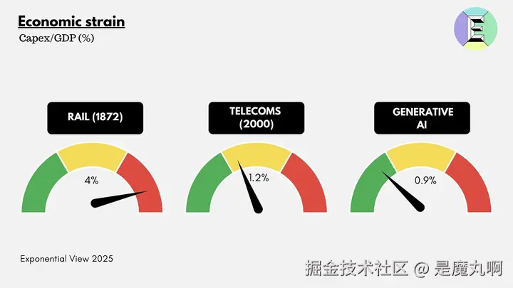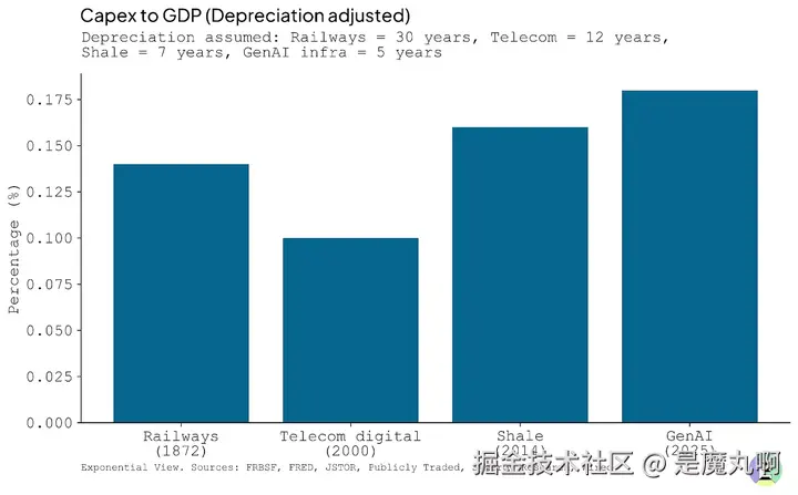 在美国铁路扩张的高峰期1872年,capex约为收入的2倍。在1990年代末的电信泡沫中,capex相当于收入的近4倍。相比之下,今天的生成式AI繁荣在大约600亿美元的收入对抗大约3700亿美元的全球数据中心capex上运行------capex与收入比率为6倍,是三个中最紧张的。