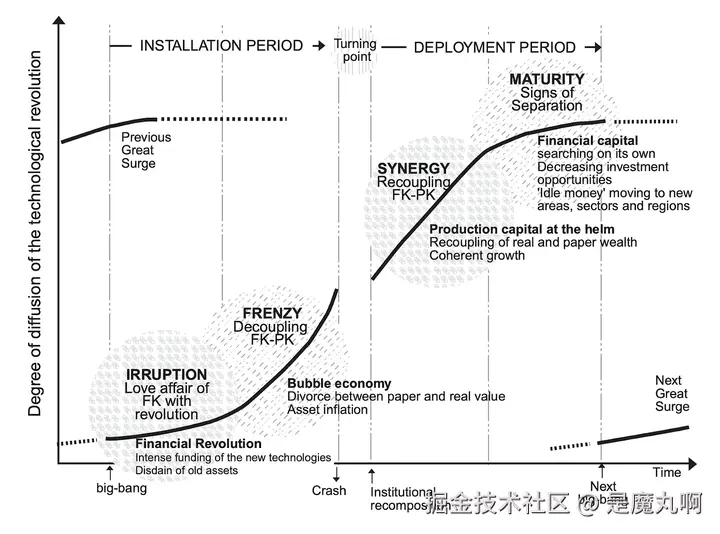 如果经济和行业压力显示繁荣的重量和收入增长其轨迹,估值热度就是市场情绪。这通常是泡沫最清楚地暴露自己的地方:投资者如何不顾基本面地为行业定价。正如Carlota Perez几十年来所论证的,金融市场倾向于在每次技术革命的早期"安装阶段"过度,投入的资本远远超过近期收入合理的水平。狂热在那一刻看起来不理性,但它是社会铺设新基础设施的机制。挑战是狂热能否进化到"部署阶段",当基础设施变得普遍并提供真正的生产力提升时。