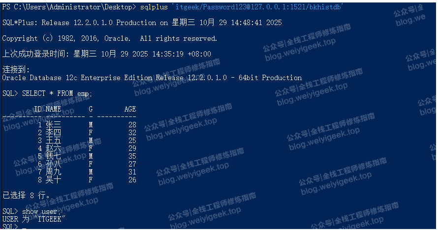 impdp USERID=\"itgeek/Password123@127.0.0.1:1521/bkhistdb\" SCHEMAS=itgeek DIRECTORY=backup_dir DUMPFILE=expdp_itgeek_20251029.dmp LOGFILE=impdp_itgeek.log PARALLEL=4 TABLE_EXISTS_ACTION=APPEND至此,完成了 Oracle 数据库使用数据泵(expdp/impdp)进行特定用户数据的备份恢复的实践。
