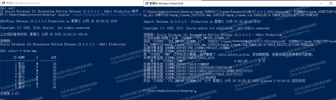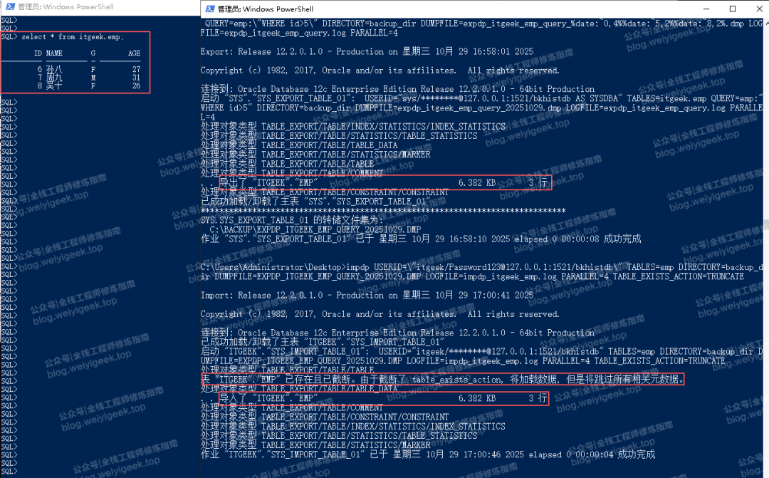 impdp USERID=\"itgeek/Password123@127.0.0.1:1521/bkhistdb\" TABLES=emp DIRECTORY=backup_dir DUMPFILE=EXPDP_ITGEEK_EMP_QUERY_20251029.DMP LOGFILE=impdp_itgeek_emp.log PARALLEL=4 TABLE_EXISTS_ACTION=TRUNCATE weiyigeek.top-导出指定条件的表数据会恢复图
