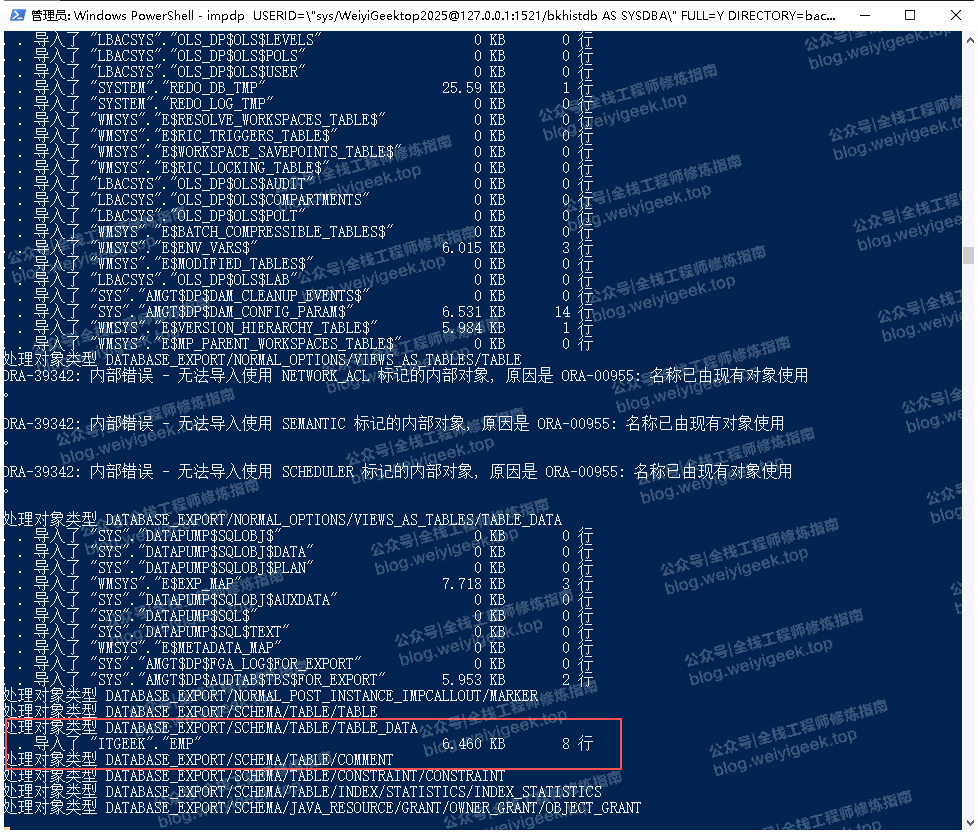 impdp USERID=\"itgeek/Password123@127.0.0.1:1521/bkhistdb\" SCHEMAS=itgeek DIRECTORY=backup_dir DUMPFILE=expdp_itgeek_20251029.dmp LOGFILE=impdp_itgeek.log PARALLEL=4 TABLE_EXISTS_ACTION=TRUNCATE weiyigeek.top-清空导入备份数据图