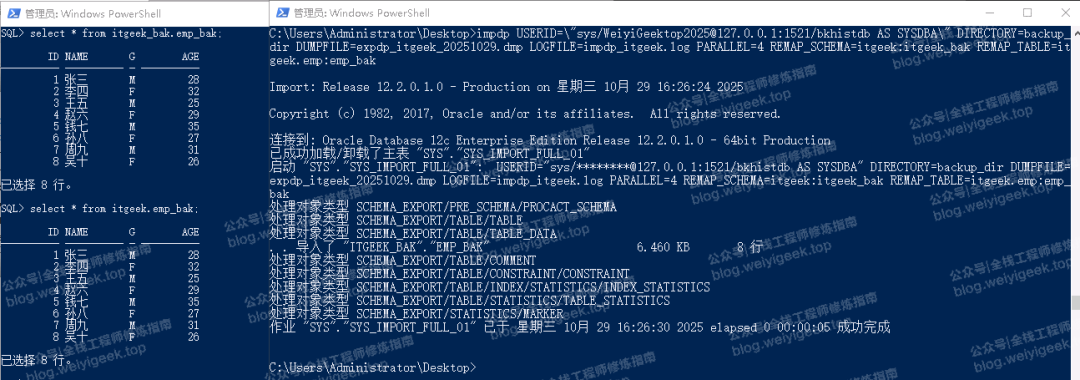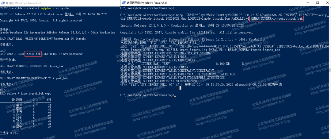 impdp USERID=\"sys/WeiyiGeektop2025@127.0.0.1:1521/bkhistdb AS SYSDBA\" DIRECTORY=backup_dir DUMPFILE=expdp_itgeek_20251029.dmp LOGFILE=impdp_itgeek.log PARALLEL=4 REMAP_SCHEMA=itgeek:itgeek_bak weiyigeek.top-导入到其它用户模式图
