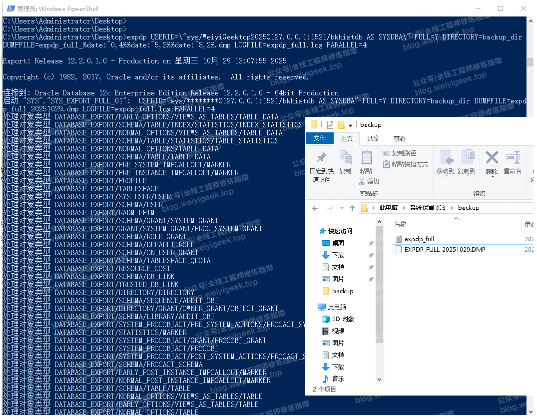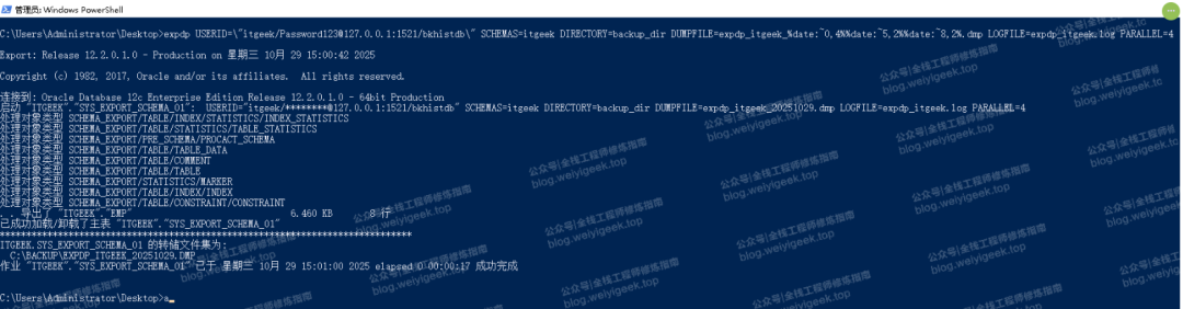 作业 "ITGEEK"."SYS_EXPORT_SCHEMA_01" 已于 星期三 10月 29 15:01:00 2025 elapsed 0 00:00:17 成功完成 weiyigeek.top-使用expdb备份指定用户数据图